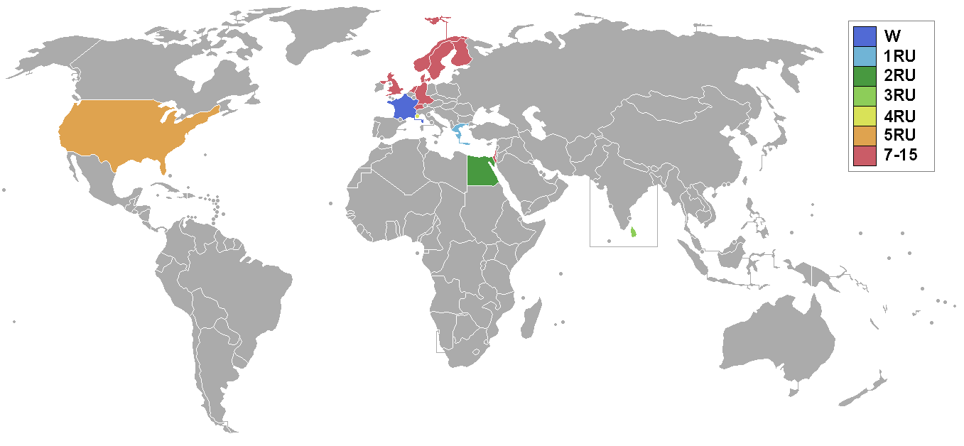 데뷔 국가 | 실론 (스리랑카) 이집트 그리스 이스라엘 모나코 노르웨이 |
