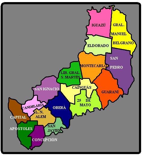 미시오네스 주는 17개의 데파르타멘토(departamentos|데파르타멘토es)로 나뉜다.