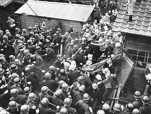 6월 19일, 새로운 조약이 발효되자 안포 투쟁은 종식되었고, 이전에 조약에 항의하느라 바빴던 수천 명의 좌익 활동가들이 풀려났다. 이 활동가들 중 다수는 규슈로 내려가 미이케의 광부들을 지원했다.[5] 그러나 안포 투쟁의 종식은 또한 수천 명의 우익 반대 시위자들 또한 자유롭게 했고, 그들 역시 다른 편을 위해 싸우기 위해 미이케로 이동하여, 6월 말과 7월에 격렬한 충돌이 극적으로 증가했다. 대기업들은 끝없는 분쟁에 자금을 대는 것에 지쳐갔고, 기시는 파업을 종식시키라는 압력을 받아 10,000명의 기동대를 파견하여 폭력을 진압했고, 경찰과 광부 사이의 결정적인 전투(kessen)가 임박한 것처럼 보였다.[5] 그러나 기시는 조약 문제 처리를 잘못한 책임을 지고 7월 15일 사임해야 했고, 미이케에서의 파업 파괴 작전은 일시 중단되었다.