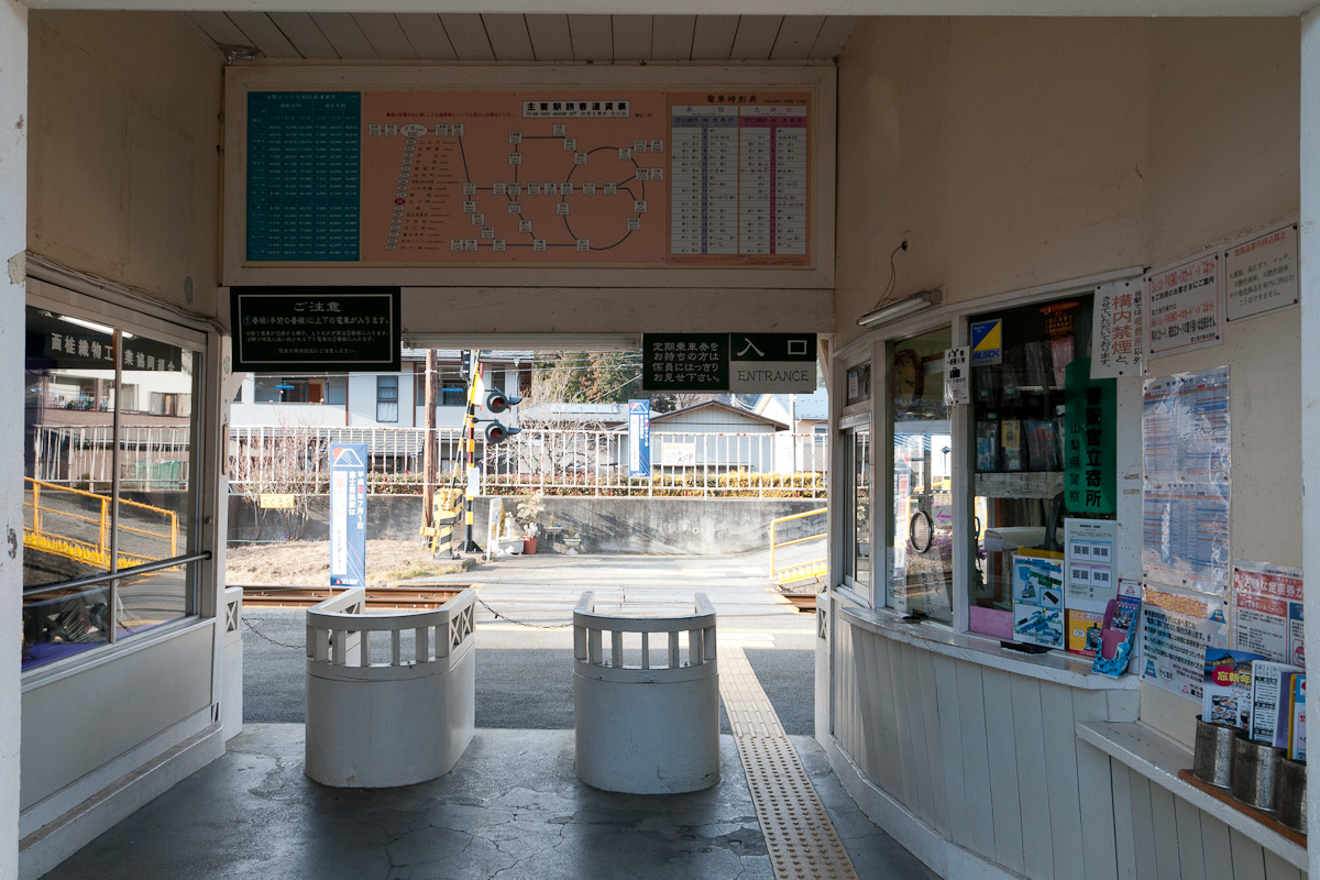 승강장의 코토부키 방면 끝은 완만한 경사면으로 되어 있으며, 이 끝에서 선로를 건너 역사까지 이어지는 구내 건널목(차단기, 경보기 설치)이 있다.[1] 승강장 위에는 잠글 수 있는 대합실이 설치되어 있다.