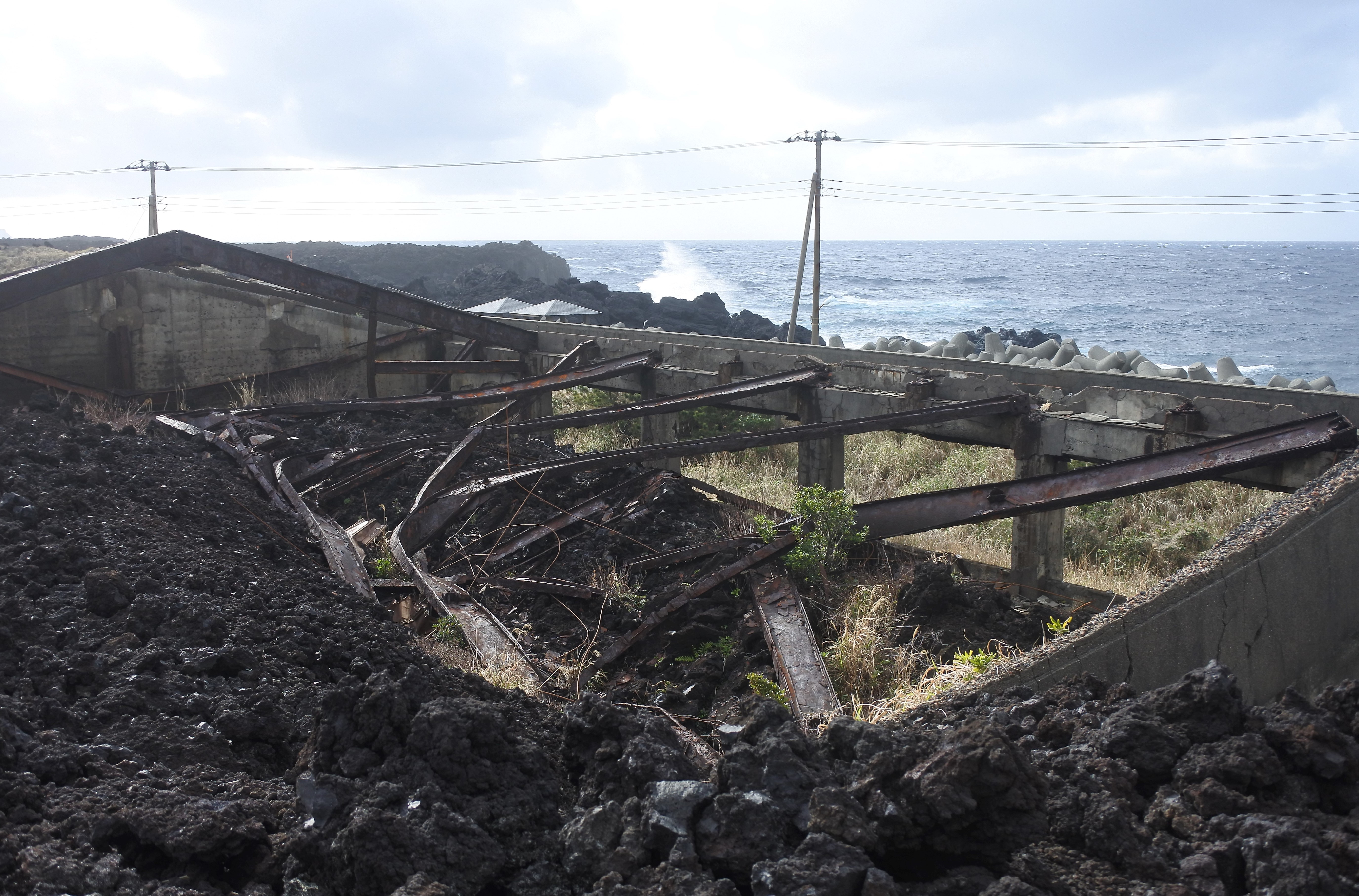 현무암질 마그마 기원의 용암은 점성이 낮아 용암류가 되어 과거 여러 차례 흘러내렸다. 1983년에는 용암류가 아고 지구 취락의 약 70%를 소실시켰다. 이 외에도 산복에는 열하 분화도 발생하며, 선상으로 늘어선 스코리아구나 해안 부근에서 마그마가 해수와 접촉하여 발생하는 마그마 수증기 폭발에 의한 폭렬 화구 지형(마르)이 여러 곳에서 관찰된다. 다이로(大路) 연못이 있는 후루미오(古澪), 신미오(新澪) 연못 터, 미야케 고등학교가 있는 야에마 등도 마르의 예이다. 새로운 용암이 해안에 닿지 않은 곳은 깎아지른 해식 절벽이 이어진다.