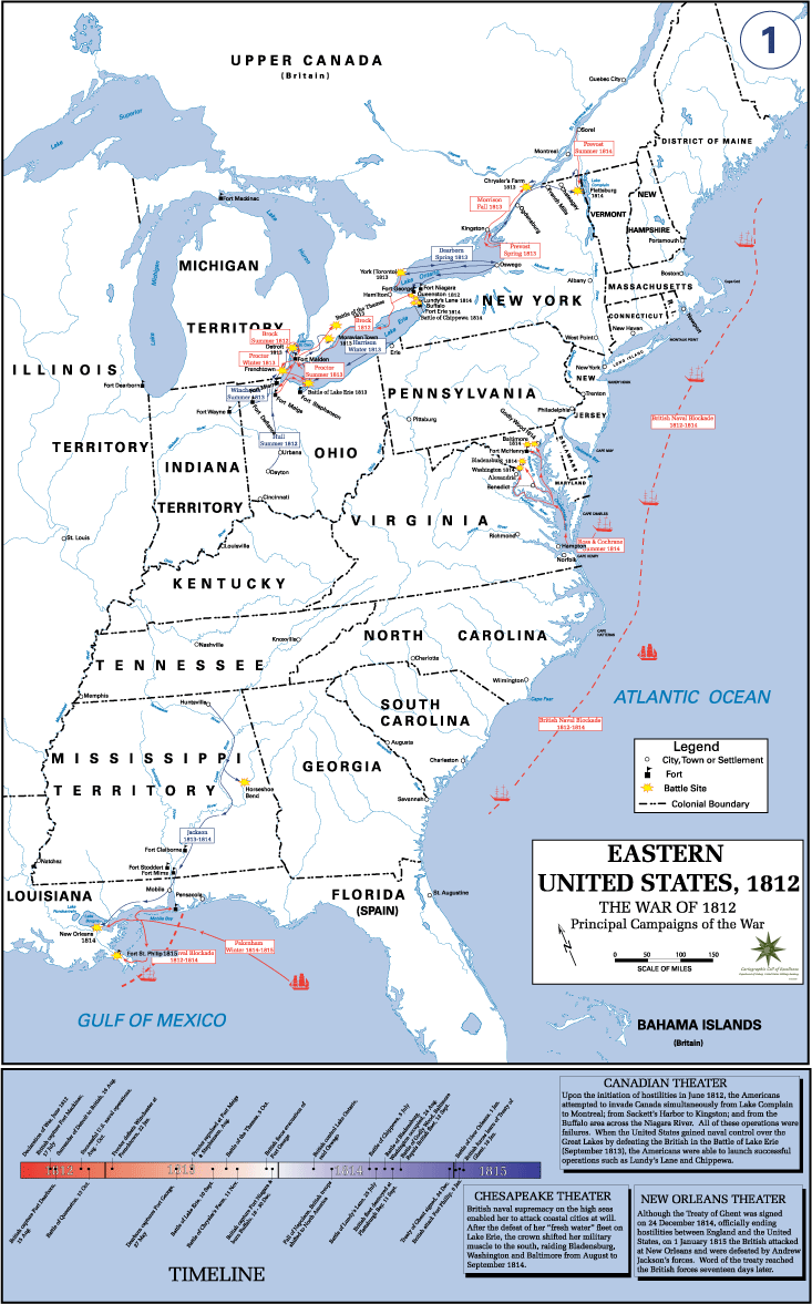 주요 전투 | 포트매키노 공방전 브라운스타운 전투 몬구아곤 전투 포트디어본 전투 디트로이트 공방전 포트웨인 공방전 미시시네와 전투 퀸스턴 하이츠 전투 프렌치맨스 크리크 전투 제1차 사켓스항 전투 가나노퀘이 기습 옥덴스버그 전투 제1차 라콜강 전투 래퍼해녹강 전투 하버디그레이스 기습 크레이니섬 전투 프렌치타운 전투 포트메기스 공방전 포트스테픈슨 전투 테임즈 전투 요크 전투 포트조지 전투 스토니 크리크 전투 비버댐 전투 블랙 락 전투 포트나이아가라 점령 버팔로 전투 제2차 사켓스항 전투 샤토게강 전투 크라이슬러스 팜 전투 번트콘 전투 포트밈스 학살 탈루샤치 전투 탈라데가 전투 오토시 전투 홀리 그라운드 전투 체샤피크만 함대 알렉산드리아 기습 블래던스버그 전투 워싱턴 방화 볼티모어 전투 노스포인트 전투 롱우즈 전투 매키노섬 전투 맬컴즈 밀즈 전투 포트이리 점령 치파와 전투 런디스 레인 전투 컨적타 크리크 전투 제2차 포트이리 쿡스 밀즈 전투 제2차 라콜강 전투 포트오스웨고 전투 플래츠버그 전투 펜사콜라 전투 (1814년) 보그느호 전투 프레리두솅 전투 뉴올리언스 전투 세인트필립 공방전 싱크홀 전투 |