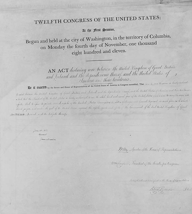 1812년 6월 1일, 제임스 매디슨 대통령은 의회에 영국에 대한 미국의 불만을 담은 메시지를 보냈지만, 선전포고를 명시적으로 요구하지는 않았다.[45] 이후 하원은 4일간 비공개 회의를 거쳐 79대 49(61%)로, 상원은 19대 13(59%)로 선전포고를 승인했다.[45] 6월 18일 매디슨 대통령이 법안에 서명함으로써 공식적으로 전쟁이 시작되었고, 다음 날 선전포고가 공표되었다.[45] 이는 미국이 다른 국가에 대해 공식적으로 선전포고한 최초의 사례였으며, 의회 투표는 미국 역사상 가장 적은 득표율로 승인된 선전포고였다.[45] 의회의 39명의 연방당 의원 중 누구도 전쟁에 찬성표를 던지지 않았고, 다른 비판가들은 이를 "매디슨 씨의 전쟁"이라고 불렀다.[46]