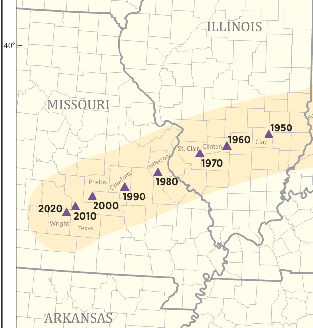 1811~12년 뉴 매드리드 지진(1811–12 New Madrid earthquakes)이 미주리 주를 강타했지만, 인구가 적어 큰 피해는 없었다.