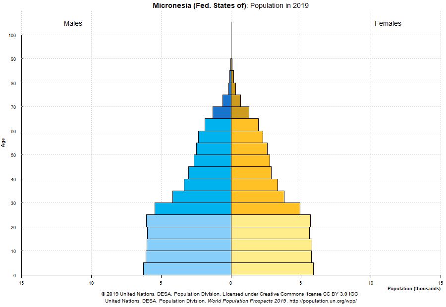 2021년 7월 1일 기준 미크로네시아 연방의 인구 구조는 다음과 같다.[4] 이 자료는 2010년 인구 주택 총조사 및 2013/2014 가구 소득 및 지출 조사를 기반으로 한 것이다.연령대 | 남성 | 여성 | 총계 | % |