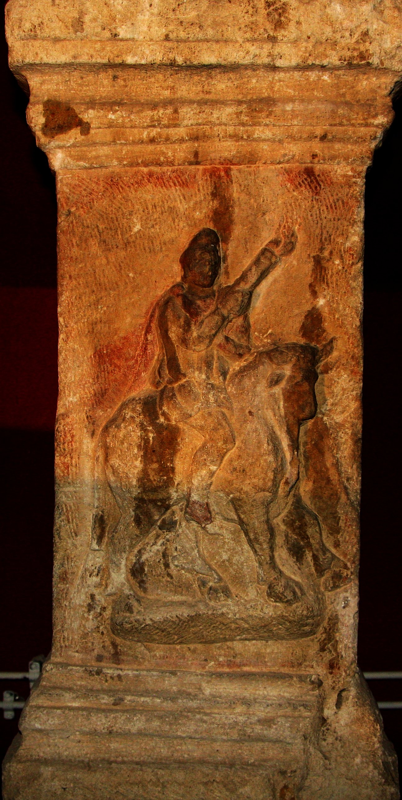 목동들이 미트라를 돕고 있으며 무기들은 주위에 흩어져 있다. 하반신이 아직 바위 속에 있는 상태이다.