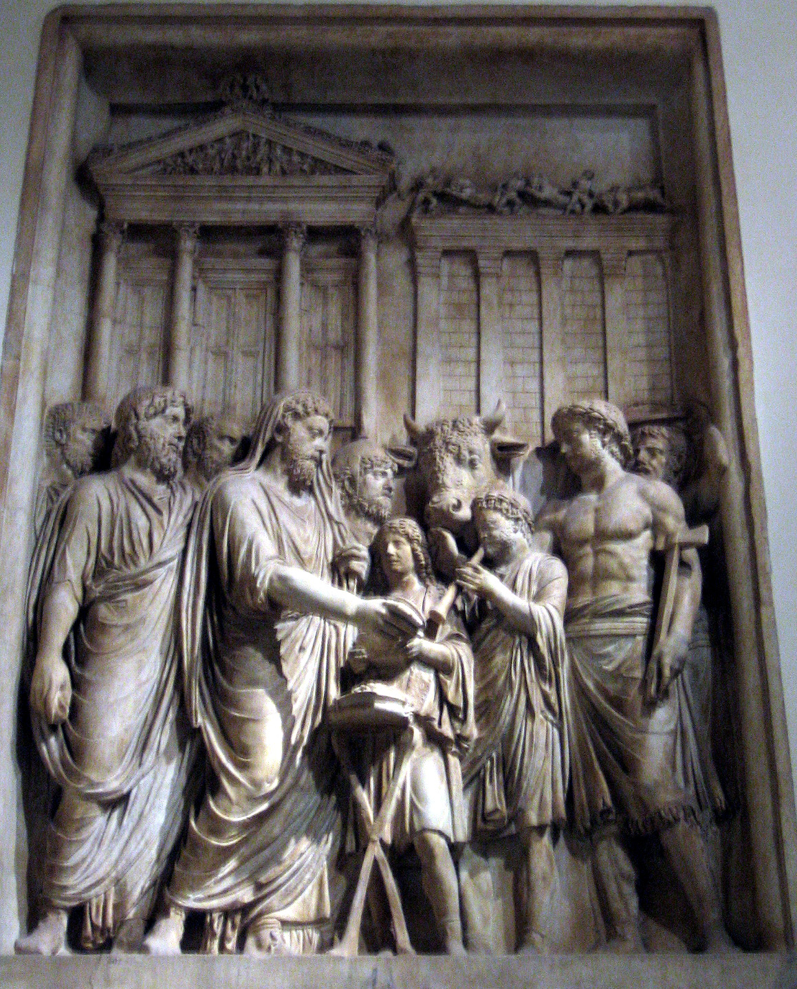 1926년에 이탈리아 로마 근처의 피아노 로마노(Fiano Romano)에서 발견되어 현재 파리의 루브르 박물관에 소장 중인 양면 부조의 앞면에는 토럭터니가 부조되어 있고 뒷면에는 만찬 장면이 부조되어 있다. 이 만찬 장면의 가운데에는 죽임을 당한 황소가 놓여 있는데, 황소의 머리와 뒷다리 하나가 보이고 있다. 미트라와 솔(Sol)이 죽은 황소에 기댄 상태로 나란히 앉아 있다. 부조를 쳐다볼 때, 오른쪽에 미트라가 있고 왼쪽에 솔이 있다. 미트라는 왼손에 횃불을 들고 있고 오른손을 솔의 등쪽으로 내뻗고 있다. 솔은 망토만 두르고 있는데, 망토는 옷을 어깨에 고정시키는 브로치를 사용하여 오른쪽 어깨 위에서 매여 있다. 솔의 머리 뒤의 광배에는 11개의 광선이 묘사되어 있는데, 이 양면 부조의 앞면의 토럭터니 장면의 왼쪽 위 모서리에 있는 솔에는 12개의 광선이 있는 것으로 보아, 1개가 목에 가려져 있는 것으로 보인다.