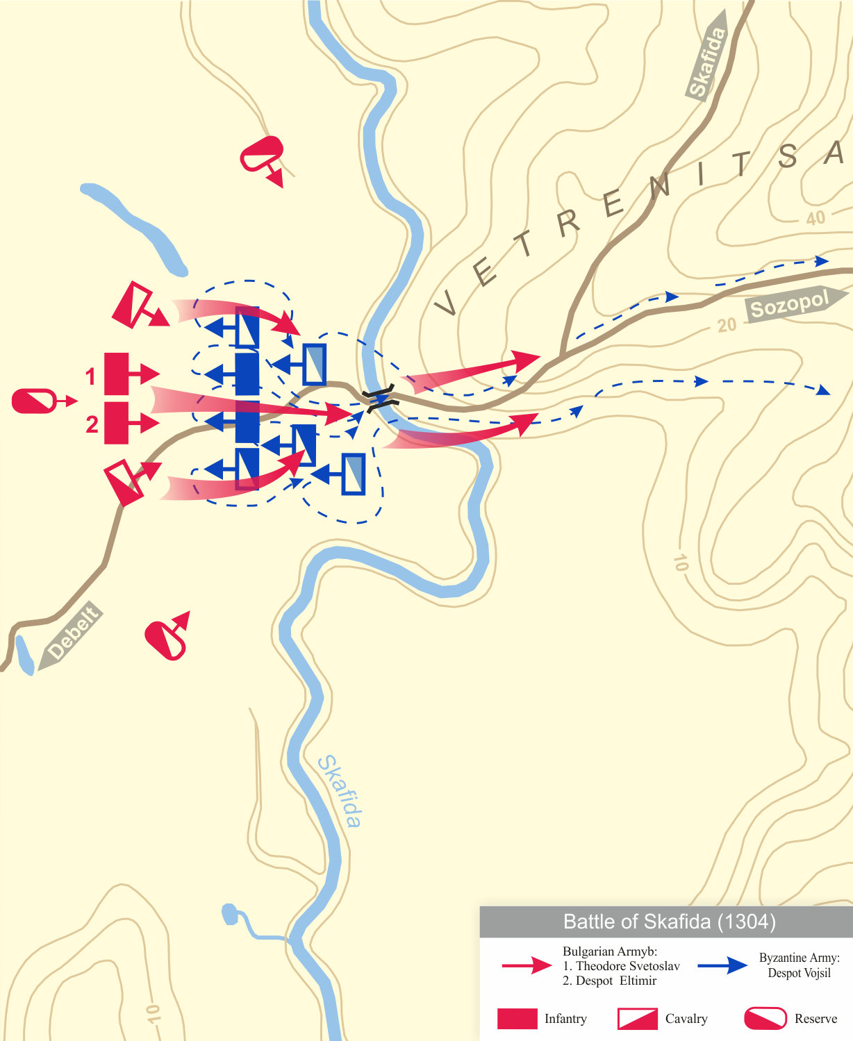 1304년 초 가을, 비잔틴군은 반격에 나섰고, 두 군대는 스카피다 강 근처에서 만났다. 전투 초반, 최전선에서 용감하게 싸운 미하일 9세는 적보다 우세했다. 그는 불가리아군을 아폴로니아로 가는 길을 따라 퇴각하게 했지만, 자신의 병사들이 추격하는 동안 흥분 상태를 유지할 수 없었다. 비잔틴군과 도망치는 불가리아군 사이에는 깊고 매우 거친 스카피다 강이 있었고, 유일한 다리는 전투 전에 불가리아군에 의해 손상되었다. 비잔틴 병사들이 큰 무리를 지어 다리를 건너려 하자 다리가 무너졌다. 많은 병사들이 익사했고, 나머지는 공황 상태에 빠졌다. 그 순간 불가리아군은 다리로 돌아와 전투의 결과를 결정하고, 적에게서 승리를 빼앗았다.