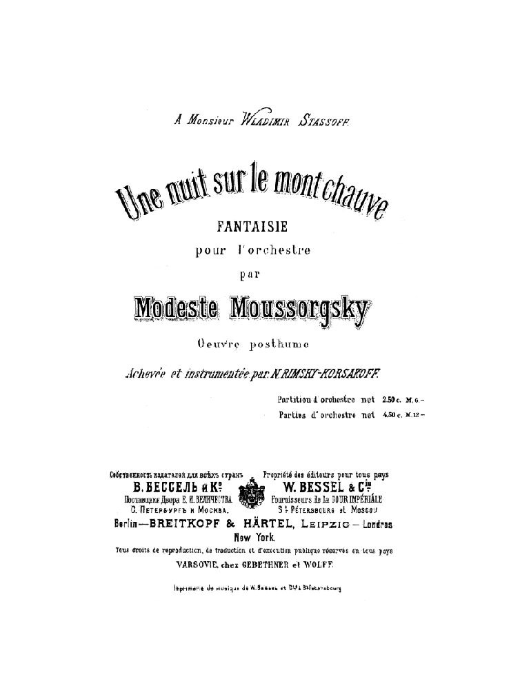 > 1882/83 시즌 동안 저는 '호반시나'와 무소르그스키의 다른 작품들을 계속 작업했습니다. '민둥산의 하룻밤'만이 제가 길을 찾을 수 없는 유일한 것이었습니다. ... 무소르그스키의 곡을 작업하면서 저는 작품을 마무리하기 위해 마지막 버전을 사용했습니다. 자, 곡의 첫 번째 형태는 오케스트라와 함께하는 피아노 솔로였고, 두 번째 형태와 세 번째 형태는 가창 작품이었고, 게다가 무대용이었습니다(오케스트레이션이 되지 않았음). 이러한 형태는 출판 및 연주에 적합하지 않았습니다. 저는 무소르그스키의 자료를 바탕으로 작곡가의 최고이자 일관성 있는 모든 자료를 유지하고 가능한 한 최소한의 제 삽입을 추가하여 기악곡을 만들기로 결정했습니다. 무소르그스키의 아이디어가 가장 잘 어울리는 형태를 만들어야 했습니다. 어려운 과제였고, 다른 무소르그스키의 작품들을 비교적 쉽게 처리했지만, 만족스러운 해결책을 두 년 동안 찾을 수 없었습니다. 형태, 변조, 오케스트레이션 어느 것도 얻을 수 없었고, 그 곡은 다음 해까지 움직이지 않았습니다.