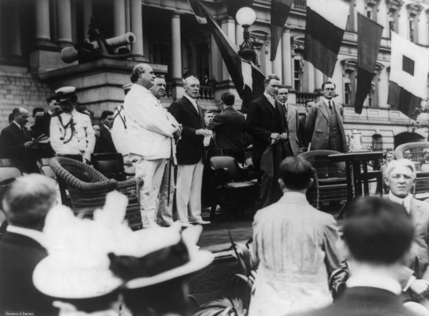 민주당은 1910년 하원을 장악했고, 우드로 윌슨은 1912년(공화당이 분열되었을 때)과 1916년 대통령으로 선출되었다. 윌슨은 의회를 효과적으로 이끌어 관세, 통화, 반독점 문제(40년 동안 정치를 지배해 온)를 새로운 진보 법률로 해결했다. 그는 상원의 베르사유 조약 통과(독일과의 전쟁 종식 및 국제 연맹 가입)를 확보하지 못했다.[77] 약화된 민주당은 1920년대 KKK와 금주법과 같은 문제로 심각하게 분열되었다. 그러나 북부 도시에서 새로운 소수 민족 유권자들을 조직하기도 했다.[78]