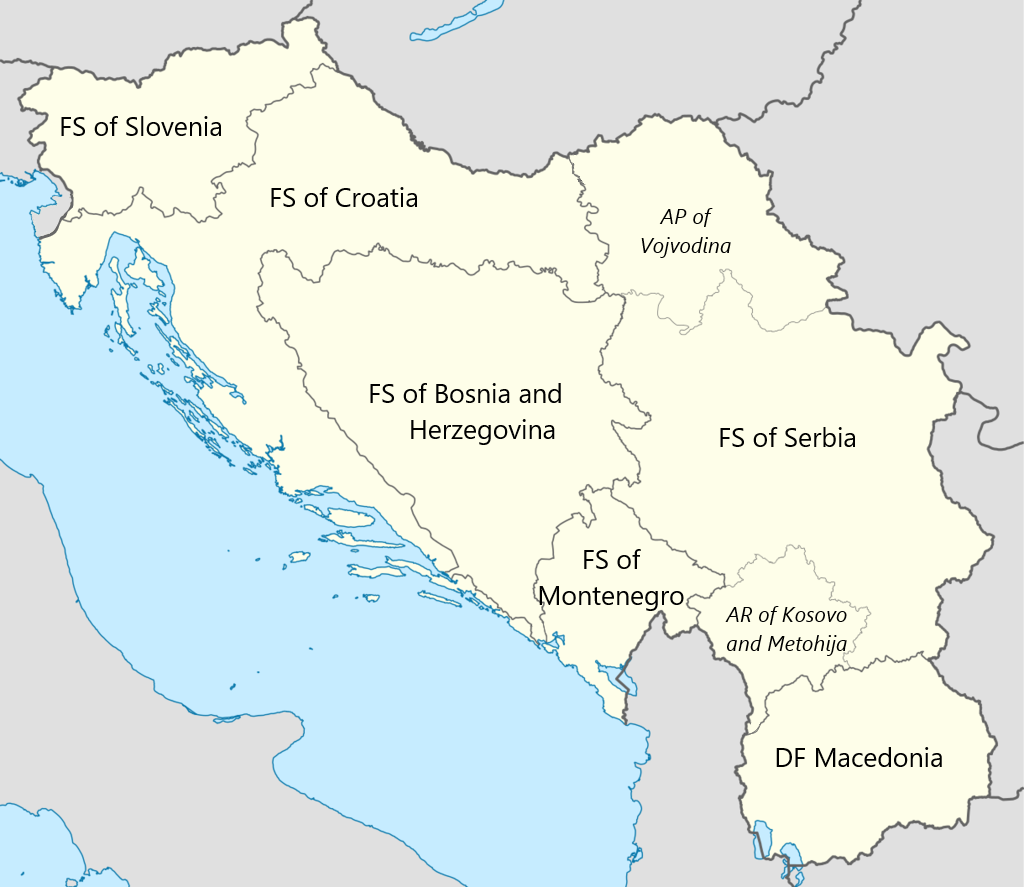 민주연방 유고슬라비아는 6개의 연방 공화국과 2개의 자치구로 구성되었다.[1]