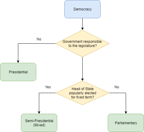 민주주의 정부가 입법부에 책임을 지는지 여부가 첫 번째 구분 기준이다. 입법 책임이 없다면 대통령제 민주주의다. 입법 책임이 있다면, 국가 원수가 국민에 의해 선출되는지 여부에 따라 다시 두 가지로 나뉜다. 국가 원수가 고정 임기로 국민에 의해 선출되면 이원집정부제(혼합형) 민주주의, 그렇지 않으면 의원내각제 민주주의이다.