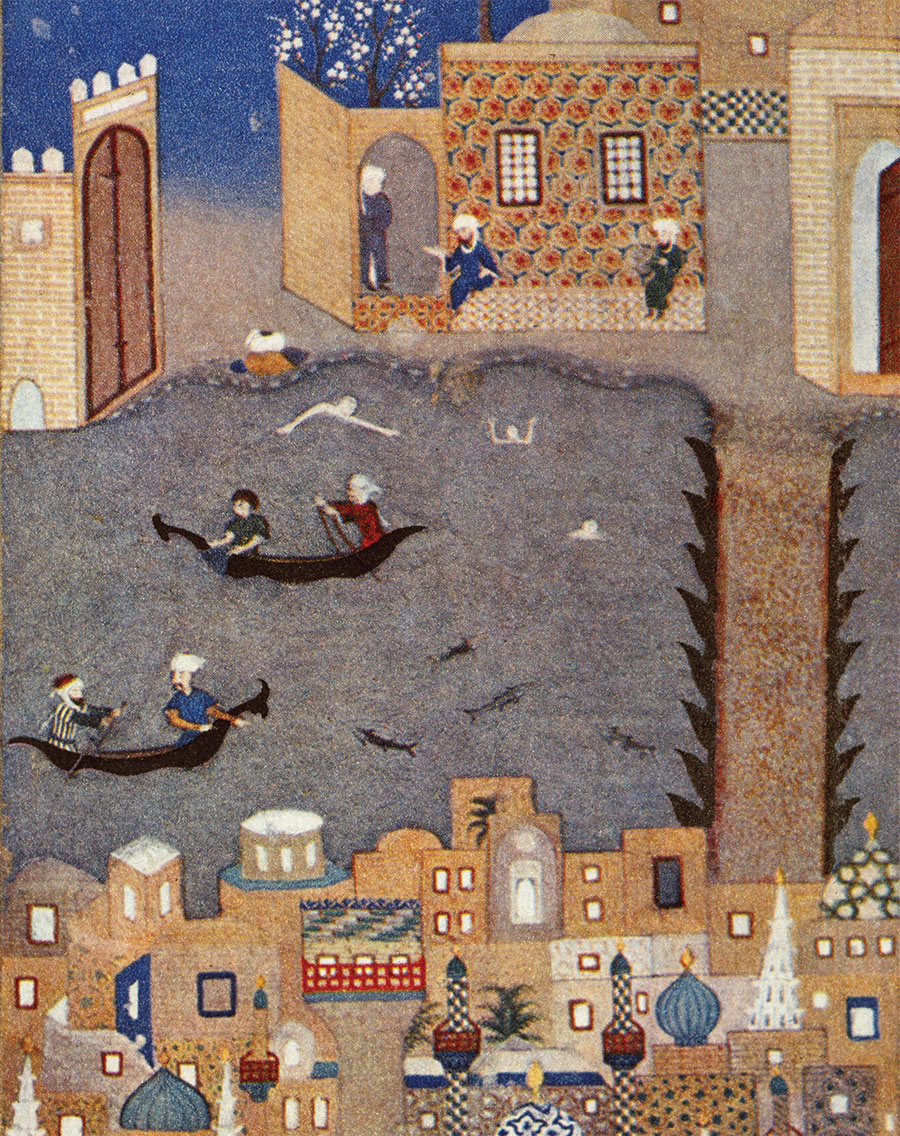 바그다드는 낮에는 활기찬 도시였고 밤에는 많은 볼거리가 있었다. 캬바레와 선술집, 백개먼과 체스를 위한 홀, 연극, 콘서트, 곡예가 있었다. 길모퉁이에서는 이야기꾼들이 군중을 사로잡았다.[38]