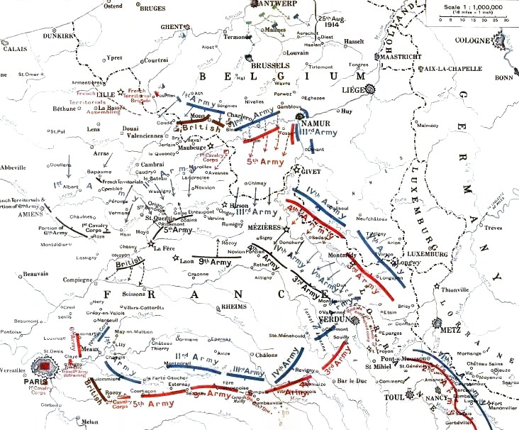 1914년 8월, 독일 제국은 슐리펜 계획에 따라 중립국 벨기에를 침공하여 프랑스를 공격했다. 프랑스는 제17계획에 따라 독일의 침공에 대응했으나, 초기 전투에서 패배하고 후퇴했다.