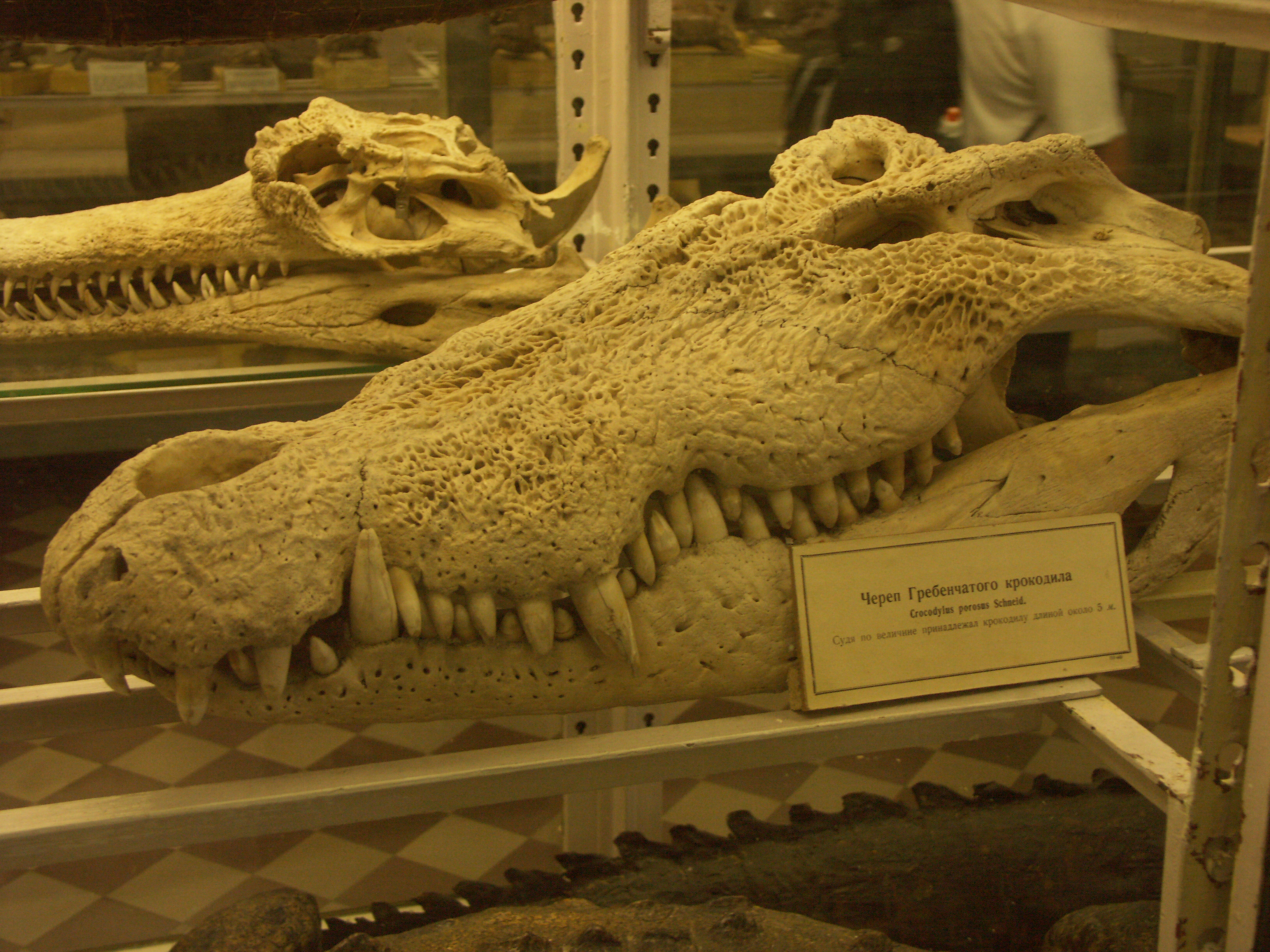 과학적으로 확인된 바다악어의 가장 큰 두개골은 캄보디아에서 수집된 국립 자연사 박물관의 표본이다. 두개골의 길이는 76cm이고 아래턱 근처의 너비는 48cm이며, 하악은 98.3cm이다. 길이는 알려지지 않았지만, 큰 바다악어의 두개골 대 길이 비율을 기준으로 했을 때, 그 길이는 6.7m에서 7m 범위였을 것으로 추정되지만, 유난히 큰 두개골을 가졌을 수도 있고 다른 큰 바다악어들과 같은 두개골 대 전체 길이 비율을 갖지 않았을 수도 있다.[208][223][209] 몸에서 분리되면, 큰 수컷 바다악어의 머리의 무게는 200kg 이상이 나갈 수 있는데, 여기에는 거대한 무는 힘을 제공하는 두개골 기저부의 큰 근육과 힘줄이 포함된다.[224] 가장 큰 이빨은 길이가 9cm였다.[225][226]