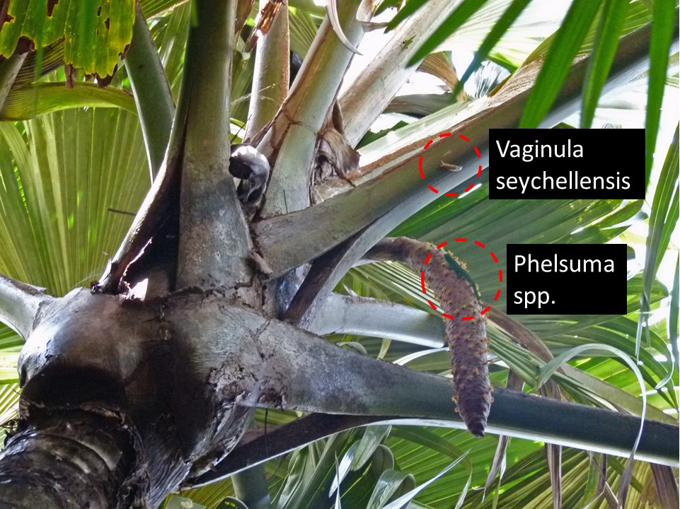 수분은 바람과 비뿐만 아니라, 서식지에 함께 사는 고유종 도마뱀붙이(밝은 녹색 도마뱀붙이), 흰 달팽이(''바기눌라 세이셸렌시스''), 그리고 여러 곤충과 같은 동물들에 의해서도 이루어지는 것으로 여겨진다.[20][28][29] 꿀과 꽃가루는 이들 동물의 중요한 먹이원이 된다.[29]
