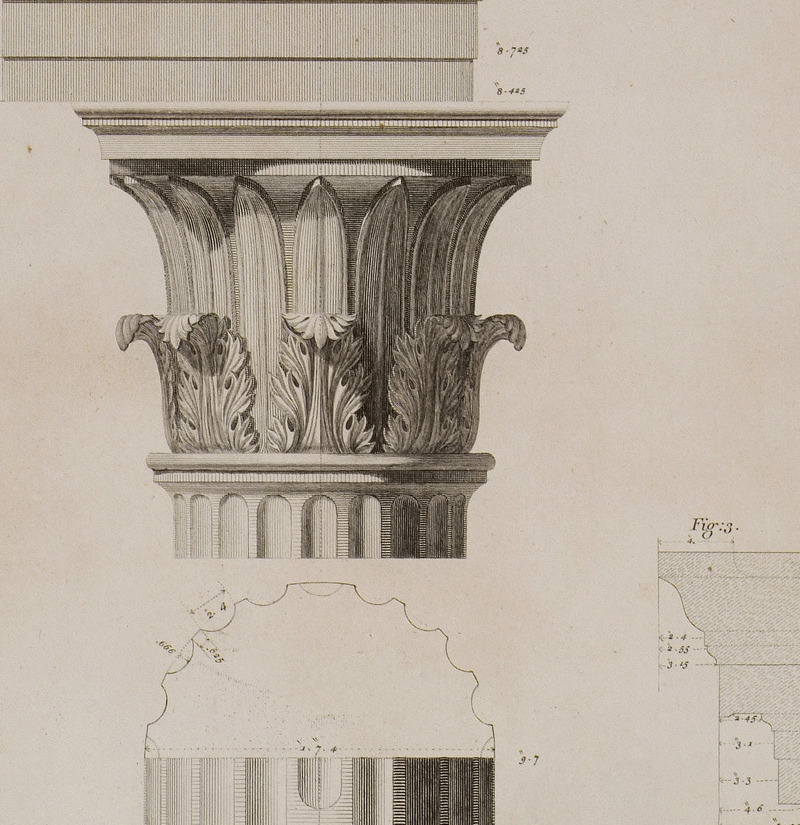 기둥들은 "바람의 탑 코린트식" 디자인의 주두를 가지고 있었는데, 이는 볼루트가 없는 "후기 변형 형태"이다.코린트식 주두에서 일반적으로 발견된다.[8] 트리톤 풍향계를 지지하는 지붕의 주두는 동일한 형태를 사용했다. 부서진 하단이 제자리에 남아 있다. 완전하게 남아 있지 않지만, 재건할 수 있을 만큼 충분한 조각이 있다. 주두 하단에는 아칸서스 잎 한 줄, 그 뒤에는 "키가 크고 좁은 잎" 한 줄이 있다.[9] 이들은 팽창하는 샤프트에 단단히 달라붙어 있으며, "연꽃" 잎, "물 잎", 야자 잎이라고도 설명된다. 고대 이집트 주두의 잎 형태와 유사성이 언급되었다.[10] 이 형태는 작고 고대 및 현대 기둥에서 발견된다. 에든버러 왕립 의과대학 퀸 스트리트, 에든버러 현관에는 4개의 예가 있지만, 건물 내 다른 곳에서는 일반적인 코린트식 주두가 사용된다.