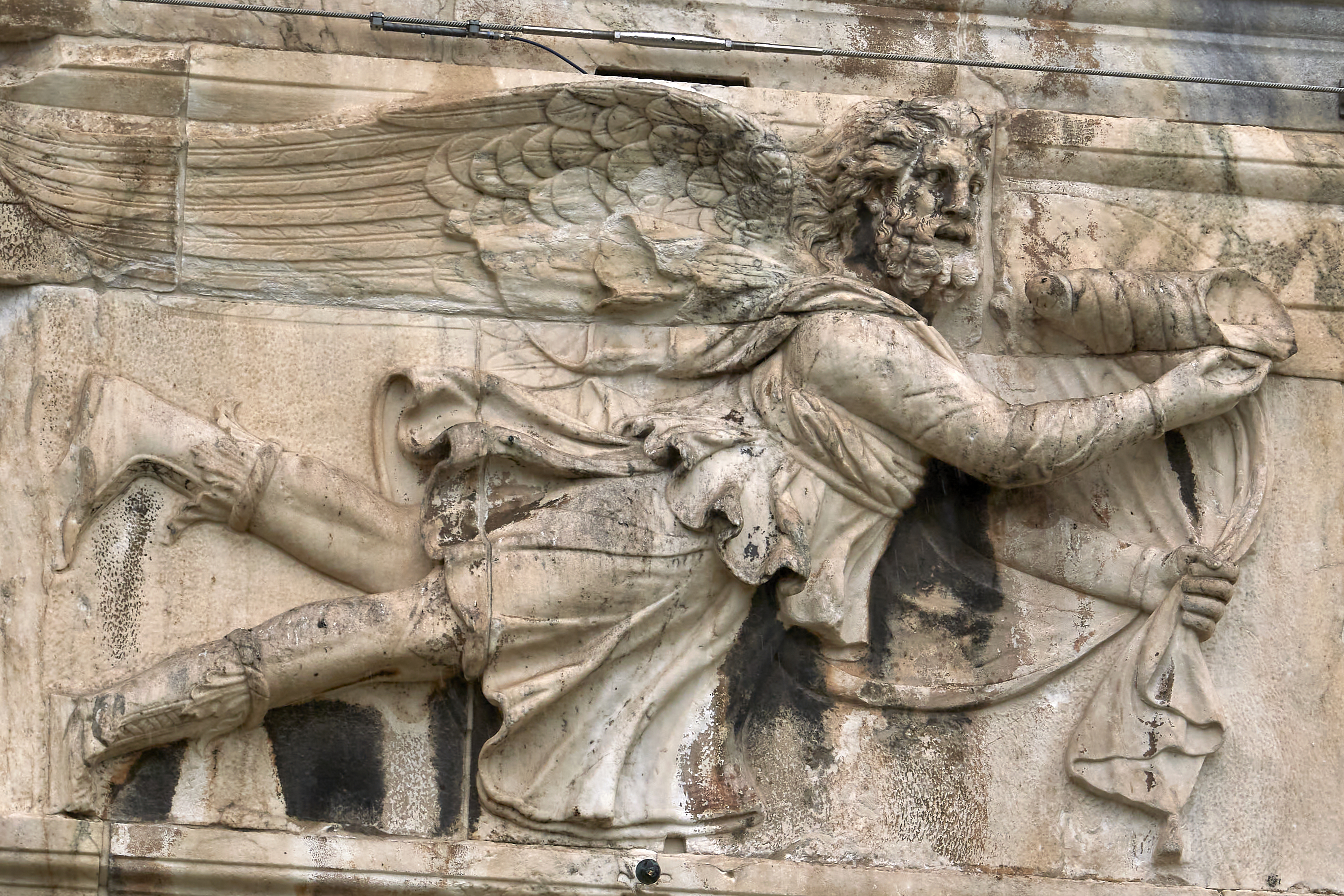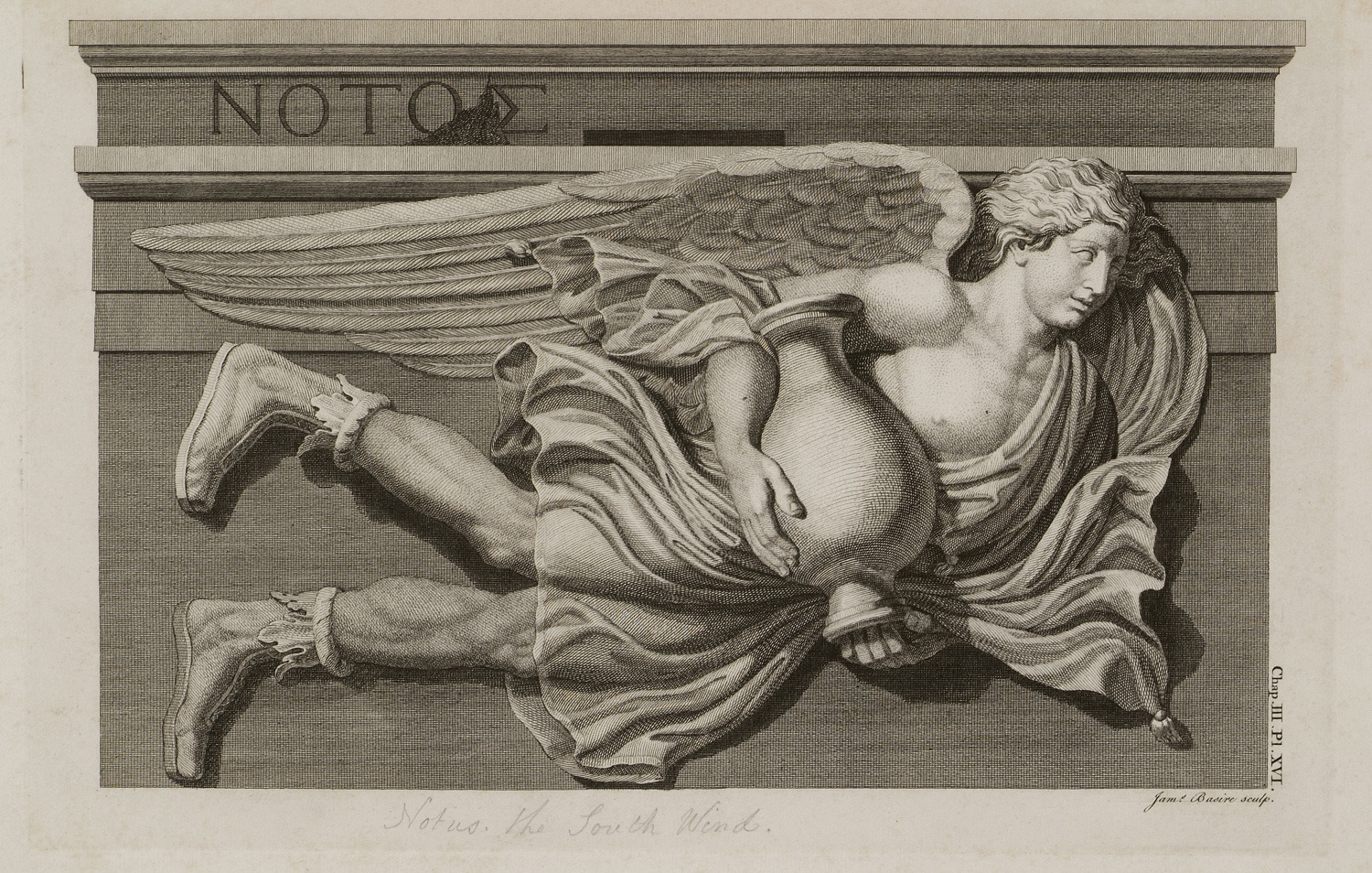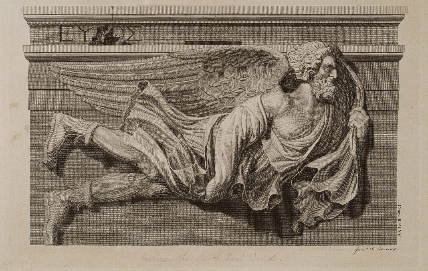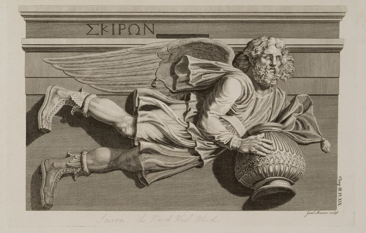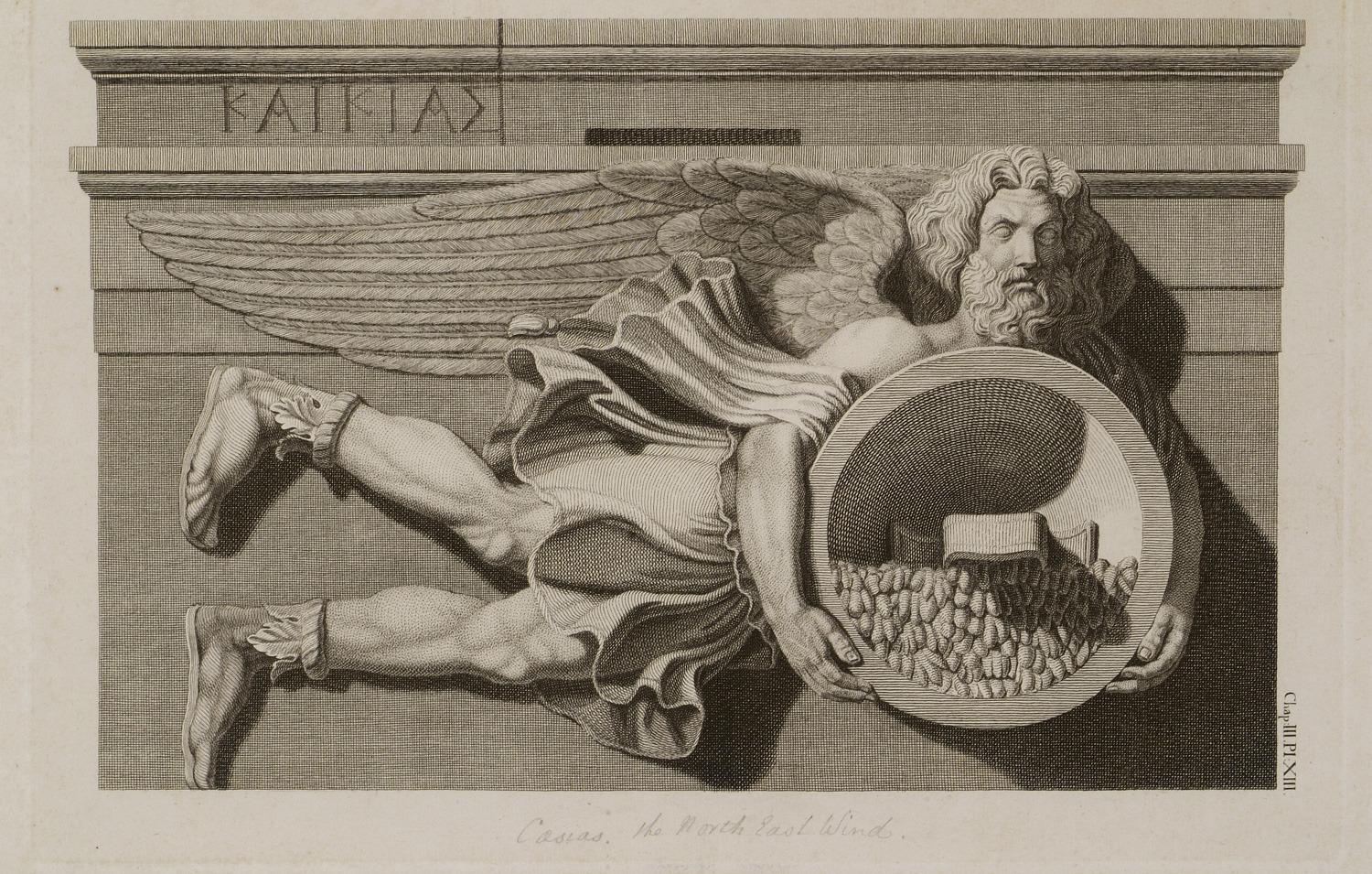 그리스인들은 고전 나침반 바람에 대해 다양한 이론을 가졌지만, 이 시대에는 여덟이 일반적이었다. 아네모이는 이름이 붙여진 하위 신이었다. 큰 부조는 운반하는 물건, 옷의 따뜻함, 신체적 특징과 표정으로 각 바람을 나타낸다. 모두 큰 날개를 가진 남성이지만, 나이가 다르다.[20] 이 묘사는 고대 시대에 알려진 가장 큰 것이다.[21] 원래 채색되었고, 청동 등 다른 재료로 된 추가 요소가 있었을 것이다.[22] 이름이 새겨져 있지만, 현재 지상에서 읽기 어렵고 금속 케이블이 통과한다.부조 바람 스튜어트와 레베트, 1762 설명, 1762 방향(에서) 속성 노투스 "남풍 노투스; 무덥고 매우 습하다" 남쪽 빗물을 위한 뒤집힌 암포라 립스 립스, 남서풍; 사로니코스 만을 가로질러 불며, 아티카 해안에 직접 불어 ... 남서쪽 맨발, 난파선을 나타내는 배의 고물 또는 방향타,[23] 또는 "좋은 순풍을 약속한다".[24] 제피로스 제피로스, 서풍; 여름에는 매우 무더운 날씨를 가져오지만, 봄에는 쾌적하고 따뜻하며 ... 서쪽 꽃이 만발한 옷자락을 가진 맨발 스키론 스키론, 북서풍; 아테네에서 가장 건조한 바람, 겨울에는 매우 춥지만, 여름에는 ... 북서쪽 뜨거운 재와 숯으로 가득 찬 뒤집힌 청동 냄비, 아마도 산불을 나타냄[25] 보레아스 보레아스, 북풍; 춥고, 사납고, 폭풍이 몰아침 북쪽 따뜻한 겨울 옷과 조개 껍질, 아마도 그의 울부짖음을 나타내기 위해[26] 카이키아스 카이키아스 또는 카에시아스, 북동풍, 흐리고, 습하고, 차갑다; 눈, 그리고 어떤 계절에는 우박과 폭풍이 동반된다 ... 북동쪽 우박을 담은 방패.[27] 아펠리오테스 아펠리오테스, 동풍; 점진적인 부드러운 비를 가져오며, 식물에 큰 도움을 준다 동쪽 과일과 곡물 작물로 가득 찬 옷자락 유로스 유로스, 남동풍; 아테네에서는 덥고 우울하며, 많은 비를 가져온다 남동쪽 옷자락