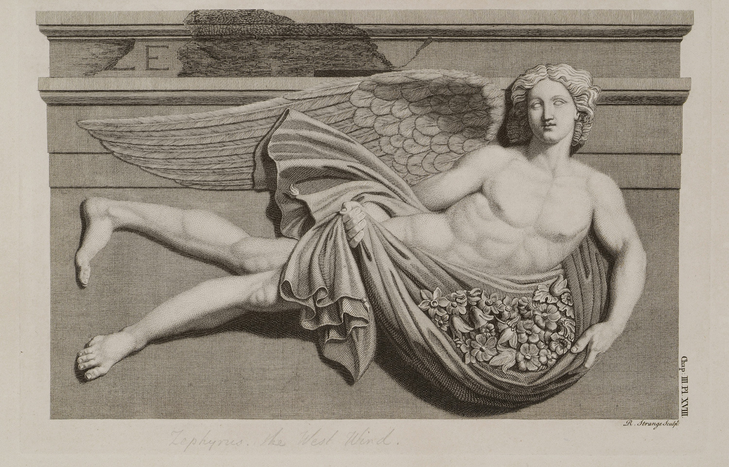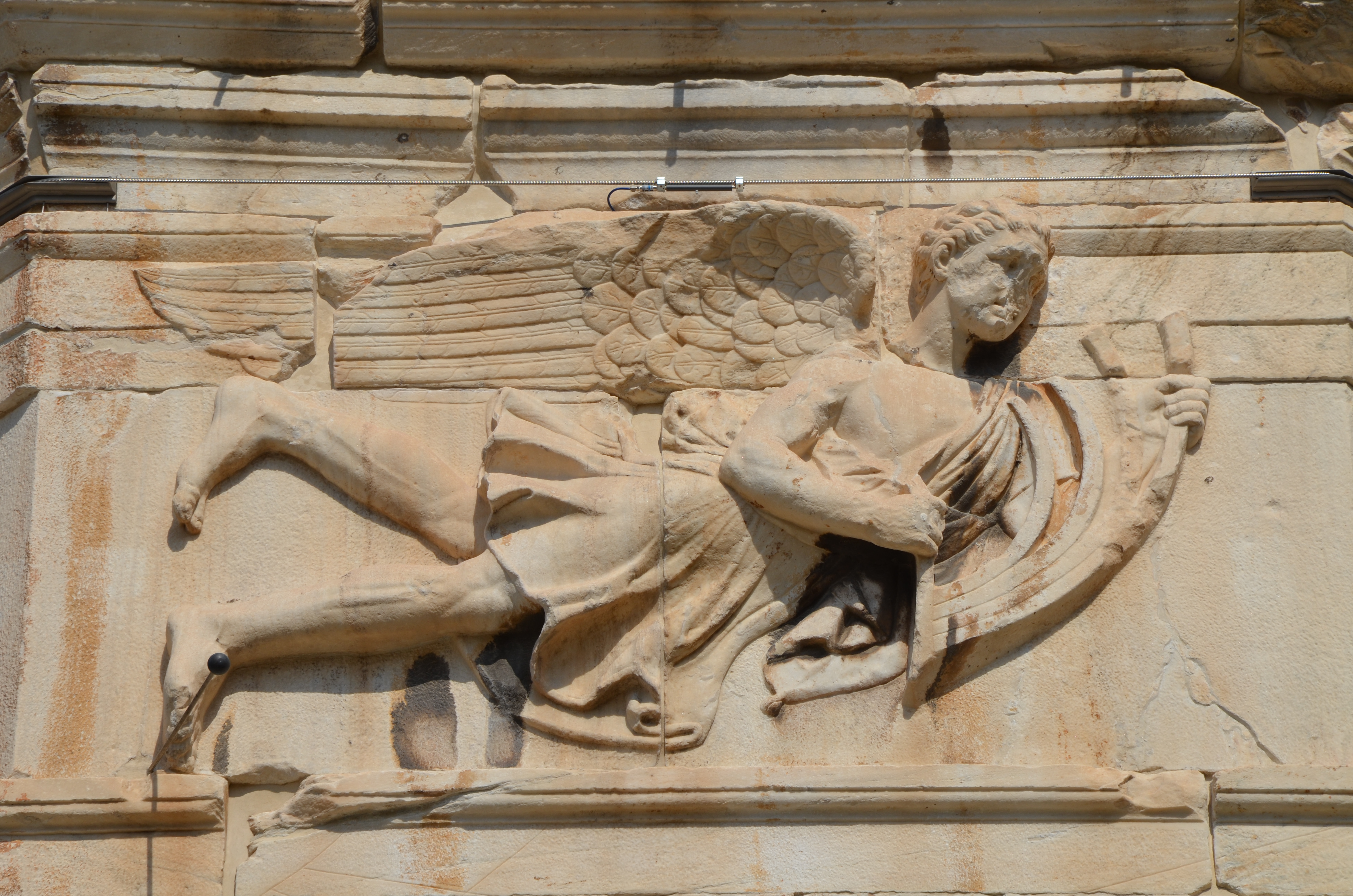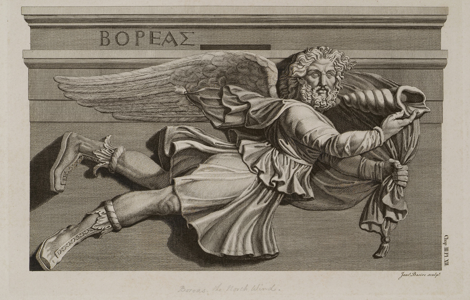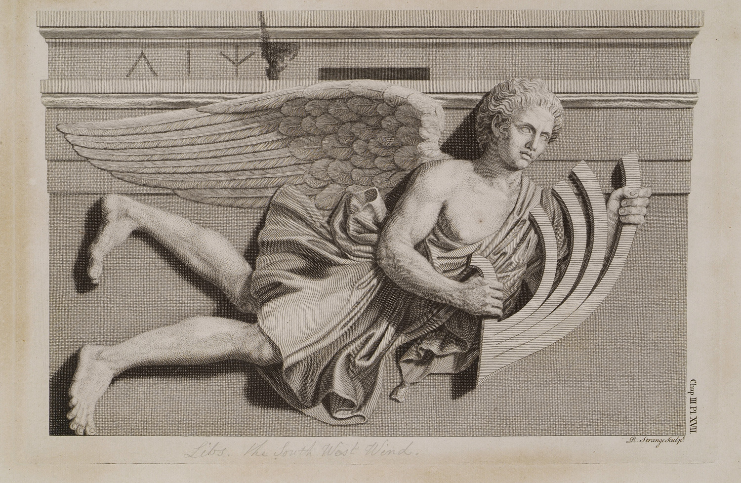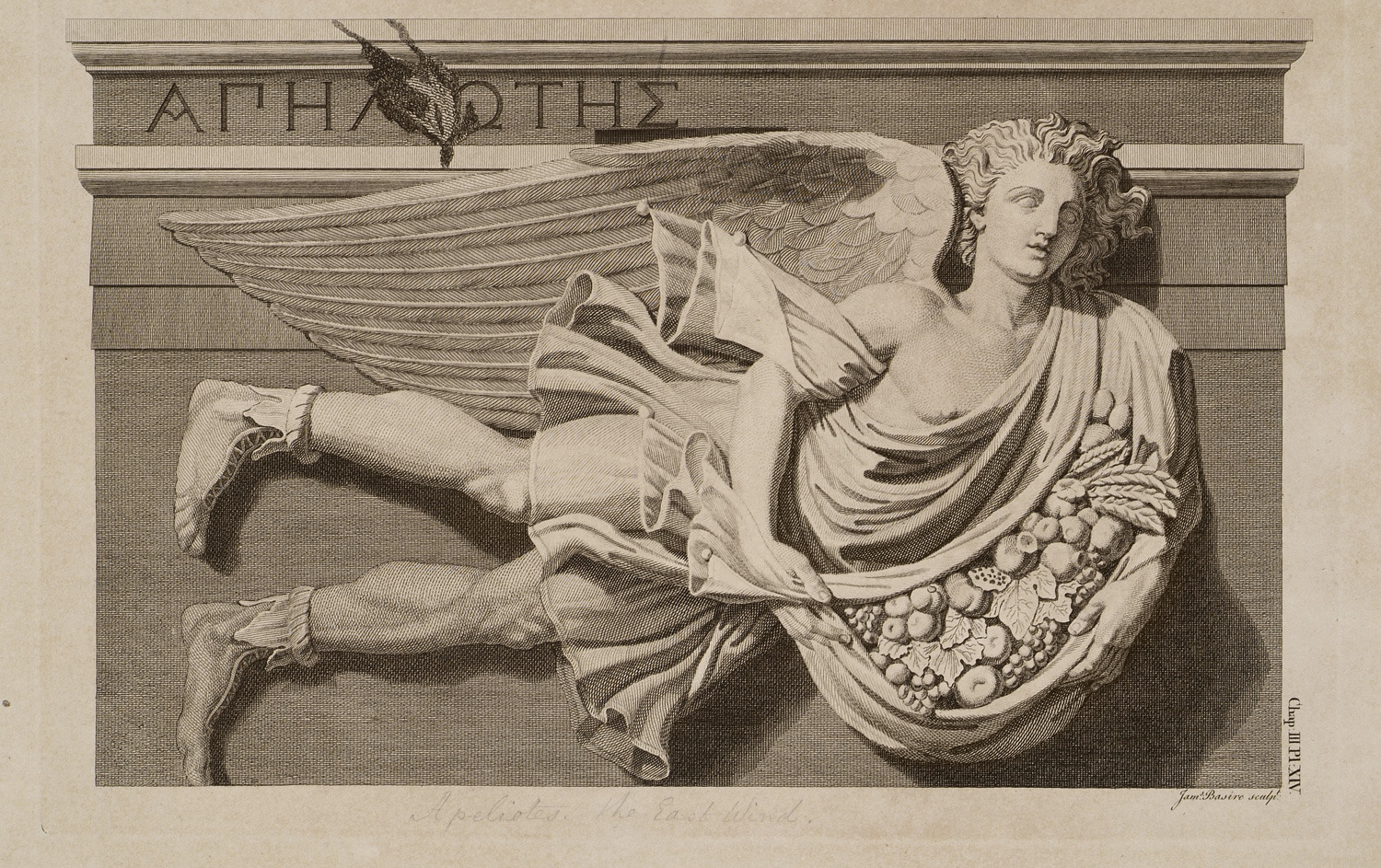 그리스인들은 고전 나침반 바람에 대해 다양한 이론을 가졌지만, 이 시대에는 여덟이 일반적이었다. 아네모이는 이름이 붙여진 하위 신이었다. 큰 부조는 운반하는 물건, 옷의 따뜻함, 신체적 특징과 표정으로 각 바람을 나타낸다. 모두 큰 날개를 가진 남성이지만, 나이가 다르다.[20] 이 묘사는 고대 시대에 알려진 가장 큰 것이다.[21] 원래 채색되었고, 청동 등 다른 재료로 된 추가 요소가 있었을 것이다.[22] 이름이 새겨져 있지만, 현재 지상에서 읽기 어렵고 금속 케이블이 통과한다.부조 바람 스튜어트와 레베트, 1762 설명, 1762 방향(에서) 속성 노투스 "남풍 노투스; 무덥고 매우 습하다" 남쪽 빗물을 위한 뒤집힌 암포라 립스 립스, 남서풍; 사로니코스 만을 가로질러 불며, 아티카 해안에 직접 불어 ... 남서쪽 맨발, 난파선을 나타내는 배의 고물 또는 방향타,[23] 또는 "좋은 순풍을 약속한다".[24] 제피로스 제피로스, 서풍; 여름에는 매우 무더운 날씨를 가져오지만, 봄에는 쾌적하고 따뜻하며 ... 서쪽 꽃이 만발한 옷자락을 가진 맨발 스키론 스키론, 북서풍; 아테네에서 가장 건조한 바람, 겨울에는 매우 춥지만, 여름에는 ... 북서쪽 뜨거운 재와 숯으로 가득 찬 뒤집힌 청동 냄비, 아마도 산불을 나타냄[25] 보레아스 보레아스, 북풍; 춥고, 사납고, 폭풍이 몰아침 북쪽 따뜻한 겨울 옷과 조개 껍질, 아마도 그의 울부짖음을 나타내기 위해[26] 카이키아스 카이키아스 또는 카에시아스, 북동풍, 흐리고, 습하고, 차갑다; 눈, 그리고 어떤 계절에는 우박과 폭풍이 동반된다 ... 북동쪽 우박을 담은 방패.[27] 아펠리오테스 아펠리오테스, 동풍; 점진적인 부드러운 비를 가져오며, 식물에 큰 도움을 준다 동쪽 과일과 곡물 작물로 가득 찬 옷자락 유로스 유로스, 남동풍; 아테네에서는 덥고 우울하며, 많은 비를 가져온다 남동쪽 옷자락