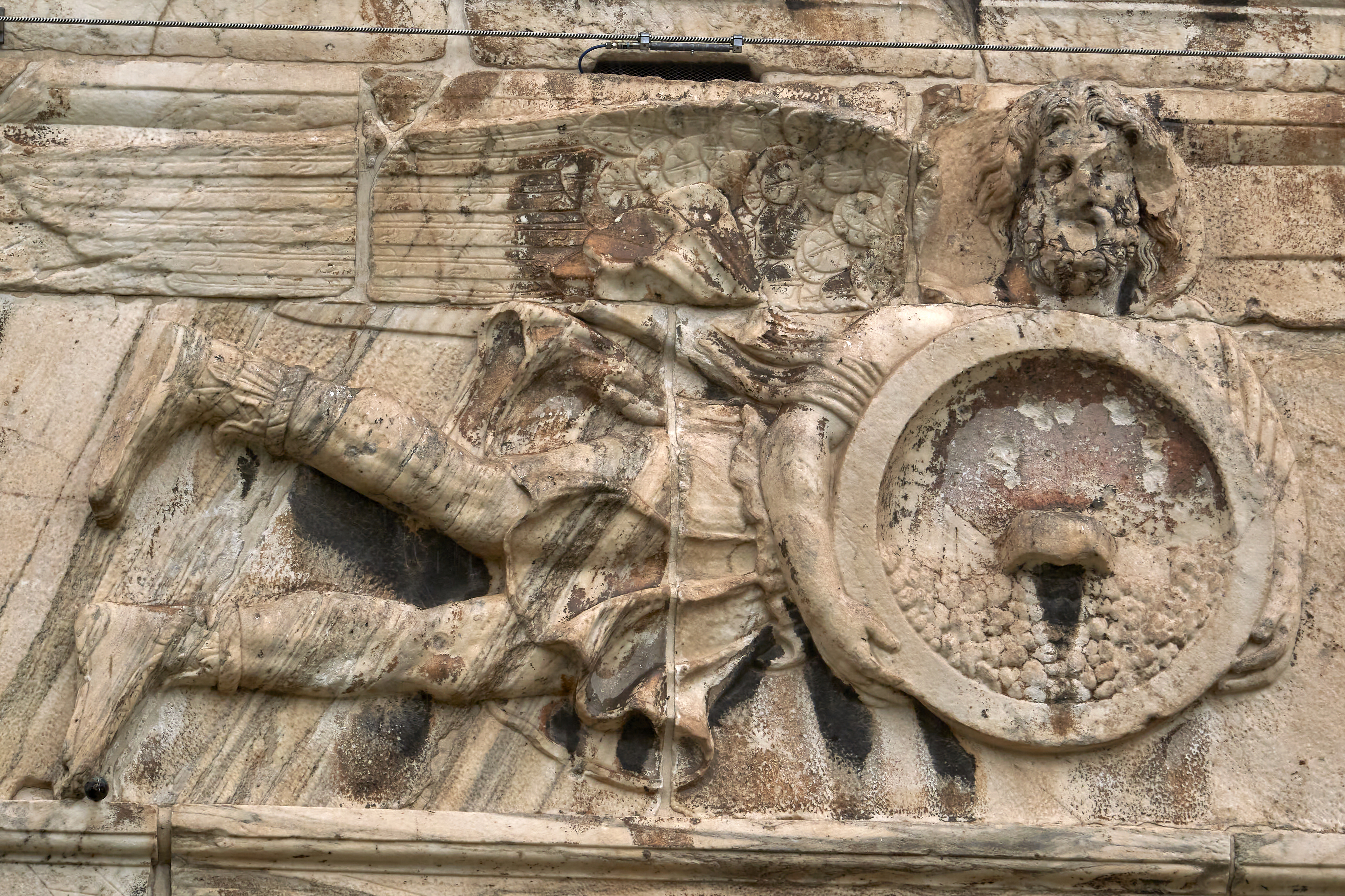 두 개의 현관은 박공이 있었고, 정면에 두 개의 코린트식 기둥이 있었으나 현재는 해체되었다. 다만, 세 기둥의 하단 부분은 남아 있다. 코린트식에서 흔치 않은 받침대가 없으며, 현관에 작은 형태의 정식 기둥을 처음 사용한 것으로 보인다.[6] 현관 지붕은 나무를 사용했을 것으로 추정되며, 건물의 유일한 목재 부분이었으나 결국 무너졌다. 돌 박공 일부는 탑 옆에 세워져 있다.[7]