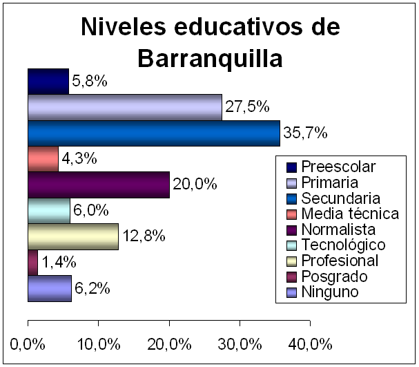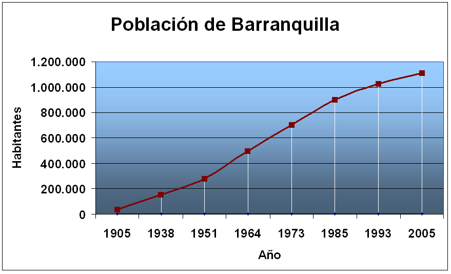 2005년 DANE 인구 조사에 따르면, 2007년 6월 30일 기준 바랑키야 인구는 1,148,506명이며, 대도시권 인구는 1,821,517명이다.[109] 이는 콜롬비아 카리브 해안에서 가장 인구가 많은 도시이며, 보고타, 메데인, 칼리에 이어 전국에서 네 번째로 큰 도시이다.[110] 도시 지역에 약 1,144,470명, 농촌 지역에 4,036명이 거주하고 있으며, 인구 밀도는 평방킬로미터당 6918.71명이다. 인구의 47.5%가 남성이고 나머지 52.5%가 여성이다. 가구의 약 57.9%가 4명 이하이다. 도시 인구의 26.7%는 다른 지방자치단체에서 태어났고 0.4%는 다른 나라에서 태어났다. 바랑키야 인구의 5.3%는 영구적인 장애를 가지고 있다.[109]