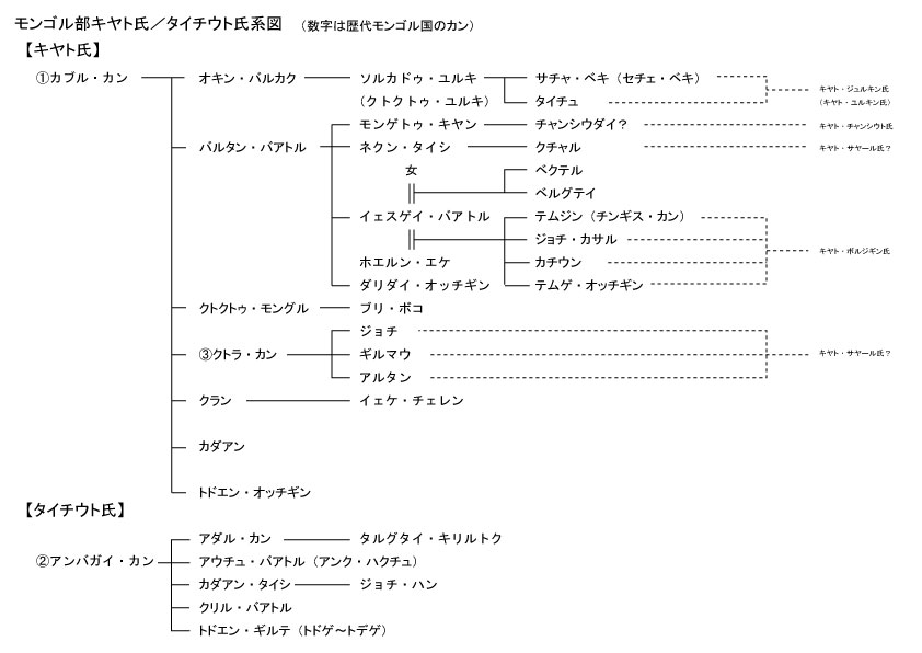 이름 한자 비고 툼비나이 세첸 둔비내 삼 카추라 갈적혼 아달긴 씨의 시조, 자손은 제3익 카랄다이 자손은 제4익 카불 칸 갈불률한 카묵 몽골 초대 칸 오킨 발카크 과근팔랍합 자손은 제5익・제6익 바르탄 팔리단 몽게투 키얀 몽가흑안 창시우다이 섐쉐치리 제8익 네쿤 타이시 섭곤대사 쿠차르 화찰아 제7익 예수게이 바아토르 열조야속개 유령이 제1익이 됨 칭기스 칸 제2익 다아리타이 오치긴 답리진 제7익 쿠토크투 몽굴 홀도로면예 제8익 쿠툴라 칸 홀도랄한 "온 몽골" 제3대 칸 조치 칸 졸적 제9익 알탄 아륵단 제10익 쿨란 바아토르 홀란팔두아 제11익 토도엔 오치긴 철단알적근 제11익