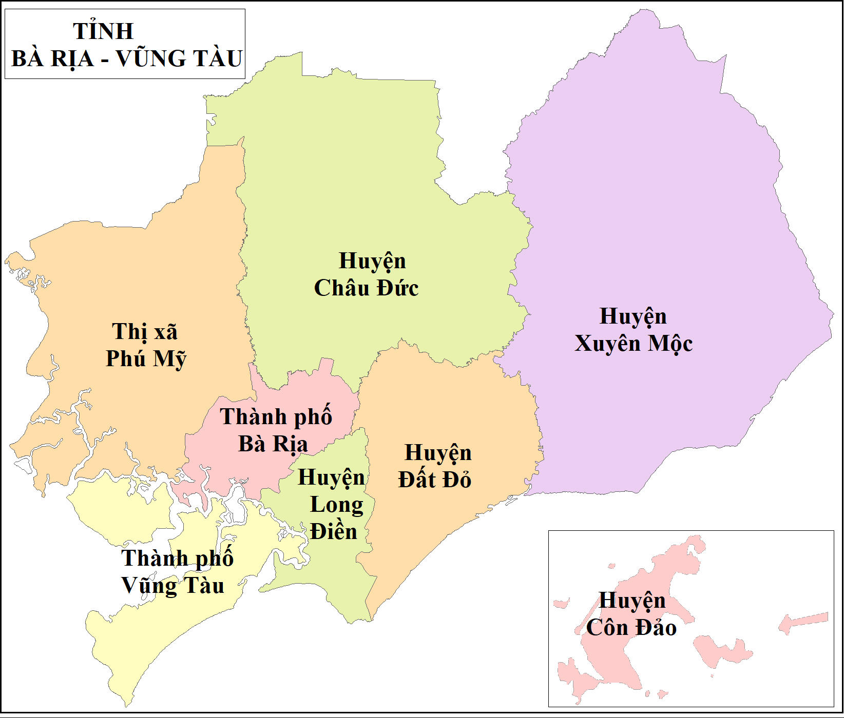 Bà Rịa - Vũng Tàu|바리어붕따우|婆地-淎艚vi는 2개의 시, 1개의 시사, 5개의 현으로 구성된다.