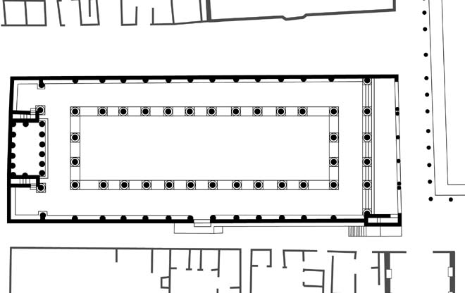 이러한 바실리카는 직사각형이었고, 일반적으로 중앙 통로와 측면 통로가 있었으며, 약간 높이 올라간 플랫폼과 양쪽 끝에 반원형의 후진이 있었고, 아마도 황제의 동상으로 장식되었으며, 출입구는 긴 쪽에 있었다.[4][5] 로마의 ''바실리카''는 사업이나 법률 문제를 처리할 수 있는 대규모 공공 건물이었다.