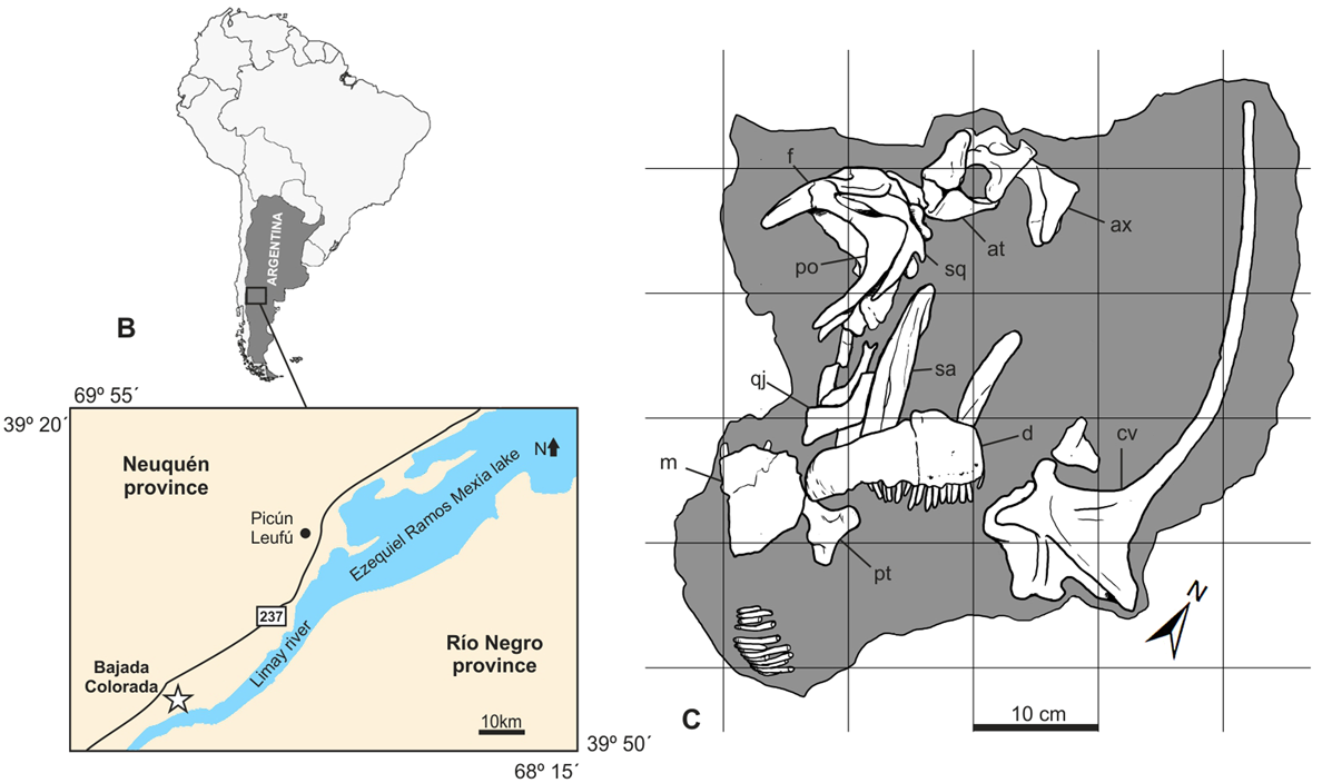 발굴 초기에는 CONICET 소속 아르헨티나 고생물학자 파블로 갈리나(es)가 작업을 주도했다.[43][44][26] 처음에는 이빨 몇 개만 노출된 상태였다.[2] 이 지역의 화석은 깨지기 쉬운 경우가 많아, 표본은 현장에서 뼈 하나하나를 발굴하는 대신, 큰 암석 덩어리를 통째로 석고로 감싸 보호한 뒤 추출하는 방식으로 발굴되었다.[43][44][2][27] 이후 연구실로 옮겨진 암석 덩어리 표면의 돌을 제거하자, 두개골 대부분과 첫 번째, 두 번째, 그리고 아마도 다섯 번째 목 척추뼈가 드러났다.[43][44][2] 이 표본은 현재 네우켄주 비야 엘 초콘(es)에 있는 에르네스토 바흐만 시립 박물관에 표본 번호 MMCh-PV 75로 보관되어 있다.[3][27]