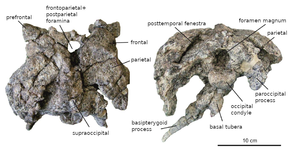 다른 편모꼬리류(디크라에오사우루스과와 디플로도쿠스과가 속한 그룹)와 마찬가지로 두개골은 길쭉하고 전체적으로 가늘어 보이는 형태를 가진다.[5] 보존된 두개골은 2019년 기준으로 디크라에오사우루스과에서 알려진 가장 완전한 것이며, 두개골 천장과 뇌상자의 대부분, 구개의 익상골, 아래턱과 위턱의 일부를 포함한다. 다만 두개골의 중간 부분은 보존되지 않았다.[3] 모식 표본의 두개골은 속성 작용 중 발생한 압력으로 인해 여러 골절이 있으며, 뇌상자는 골절 없이 형태가 변형되었다.[5] 2023년에는 후안 가르데레스와 동료들이 뼈의 CT 스캔으로 얻은 디지털 3D 재구성을 기반으로 두개골에 대한 포괄적인 설명을 발표했다.[5]