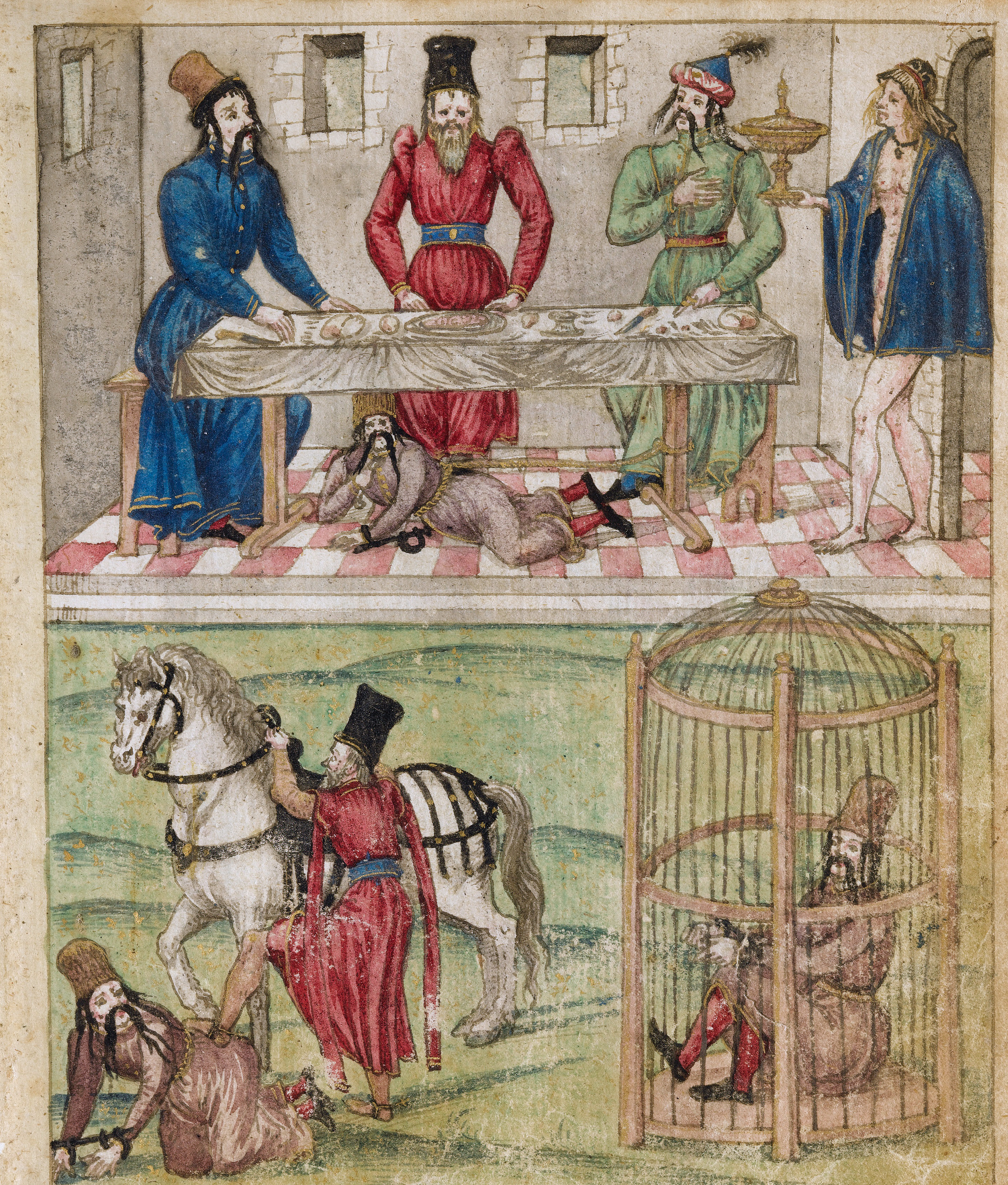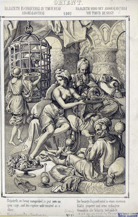 그러나 특히 유럽에서는 바예지드가 포로 생활 중 극심한 굴욕을 당했다는 이야기가 널리 퍼졌다. 그가 쇠사슬에 묶인 채, 그의 아내 올리베라 데스피나가 티무르의 연회에서 반라 상태로 시중드는 것을 강제로 지켜봐야 했다는 이야기,[20] 티무르가 바예지드를 발 받침대로 사용하거나, 쇠창살이 달린 우리(가마)에 가두어 끌고 다니며 모욕했다는 등의 내용이다.[21] 이러한 학대설은 아랍 역사가 이븐 아랍샤(Ibn Arabshah), 세르비아 출신 콘스탄틴 오스트로비카(Constantine of Ostrovica), 교황 비오 2세, 베네치아 출신 테오도르 스판두네스(Theodore Spandounes) 등의 기록을 통해 확산되고 구체화되었다.[26][27][29][30][31] 이븐 아랍샤는 바예지드가 "새장 속의 새처럼 감금되었다"고 묘사했으며,[27] 아내가 연회에서 시중드는 것을 보고 "마음이 산산이 조각났다"고 기록했다.[26] 하지만 이러한 묘사가 실제 감금을 의미하는 것인지, 아니면 수사적 표현인지는 불분명하다.[28] 실제로 바예지드의 포로 생활을 목격한 독일인 요한 실트베르거(Johann Schiltberger)나 프랑스 기사 장 르 메잉르(Jean II Le Maingre), 티무르 궁정을 방문했던 스페인 사절 클라비호(Clavijo) 등 동시대 인물들의 기록이나 15세기 초의 그리스 측 자료에서는 우리나 학대에 대한 언급을 찾아볼 수 없다.[24] 다만, 바예지드가 탈출을 시도한 후 감시가 강화되어 야간에는 족쇄를 차고, 이동 시에는 격자가 달린 가마에 태워졌다는 기록은 존재한다.[98][99][100]