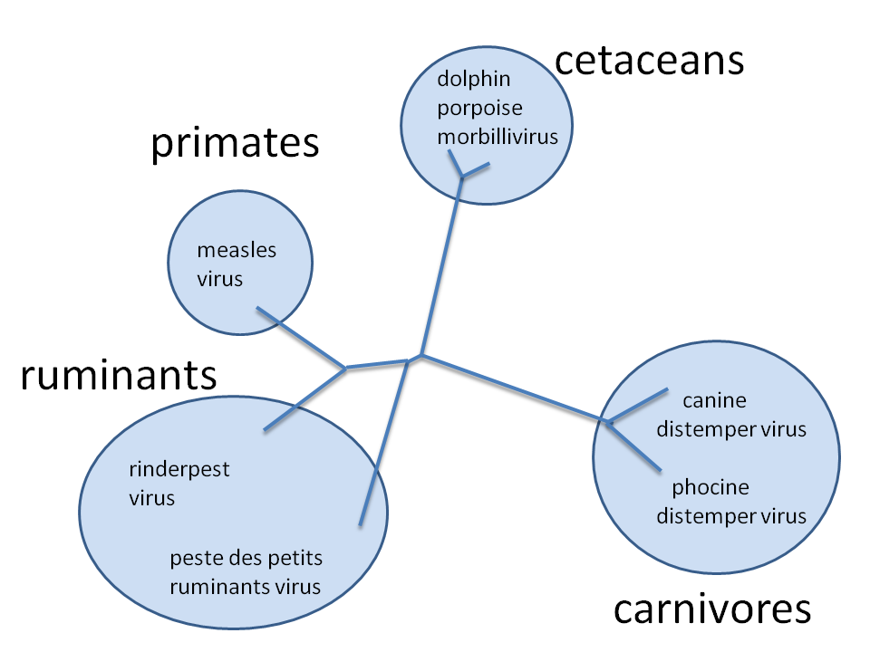 이러한 메커니즘을 통해 새로운 바이러스가 끊임없이 나타나고 있으며, 이는 바이러스성 질병을 통제하려는 인류의 노력에 지속적인 어려움을 안겨준다.[22][23] 현재 알려진 대부분의 바이러스 종은 공통 조상으로부터 진화해 온 것으로 여겨진다. 비록 모든 바이러스가 하나의 기원에서 시작되었다는 "바이러스 우선" 가설이 완전히 증명되지는 않았지만, 수많은 현대 바이러스들이 과거의 소수 바이러스로부터 진화했다는 점에는 의심의 여지가 거의 없다.[24] 예를 들어, 모르빌리바이러스는 서로 밀접하게 관련된 바이러스 그룹으로, 다양한 동물을 감염시킨다. 여기에는 사람에게 홍역을 일으키는 바이러스, 개, 고양이, 곰 등 다양한 포유류를 감염시키는 개 디스템퍼 바이러스, 소와 물소에게 우역을 일으키는 바이러스, 그리고 물개나 돌고래 등을 감염시키는 다른 바이러스들이 포함된다.[25] 이들 중 어떤 바이러스가 가장 오래되었는지 단정하기는 어렵지만, 이처럼 다양한 숙주를 감염시키는 밀접하게 연관된 바이러스 그룹의 존재는 이들의 공통 조상이 매우 오래전에 존재했을 가능성을 시사한다.[26]