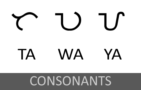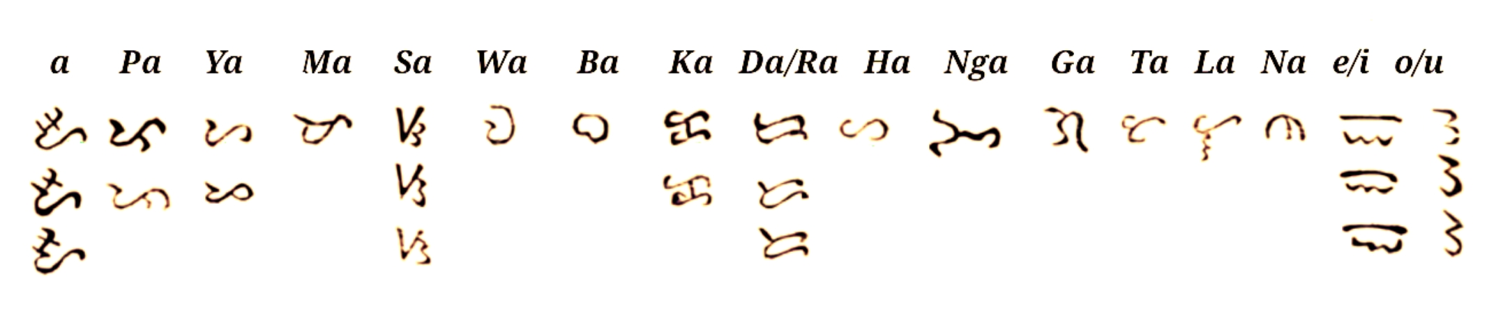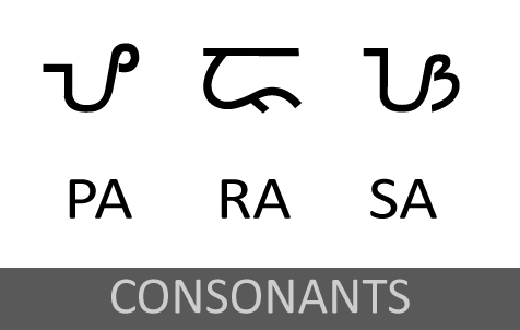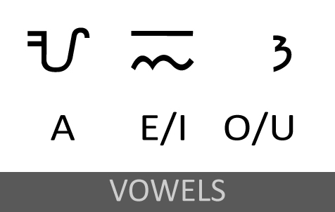 특정 자음에 a 이외의 모음이 함께하는 소리를 표기하려면, ba(--)를 나타내는 자음 문자에 i, e를 나타내는 모음 기호를 추가하여, ba의 a 모음을 i, e로 변화시킴으로써 bi, be(--)의 소리를 나타낼 수 있다.