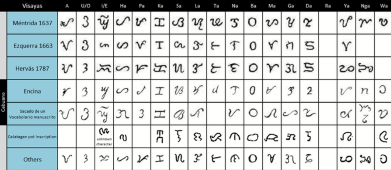 페르디난드 마젤란의 동료인 안토니오 피가페타는 1521년 비사야스 지역 사람들이 문맹이었다고 기록했다. 그러나 1567년 미겔 로페스 데 레가스피는 세부에서 비사야스 사람들이 말레이 사람들과 같은 문자와 기호를 가지고 있으며, 뾰족한 도구로 대나무 껍질과 야자잎에 글을 쓴다고 보고했다.[28] 1668년 프란시스코 알시나는 비사야스 사람들의 문자가 타갈로그 사람들로부터 전해졌으며, 타갈로그 사람들은 보르네오 사람들로부터 배웠다고 기록했다. 비사야스 사람들은 타갈로그 사람들로부터 문자를 배워 '모로 문자'라고 불렀는데, 이는 모로 사람들이 가르쳤기 때문이다.[47] 1676년 프란시스코 데 산타 이네스는 바이바인tl이 여성에게 더 흔한 이유를 설명하면서, 여자아이들은 남자아이들처럼 학교에 다니지 않아 시간을 보내기 위해 문자를 더 잘 활용한다고 언급했다.[29]