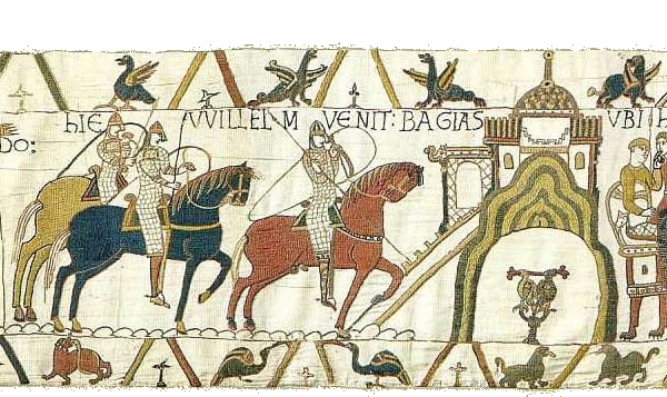 바이외 태피스트리는 11세기 후반 제작된 약 70미터 길이의 자수 작품으로, 노르만 정복 과정, 특히 헤이스팅스 전투를 중심으로 1064년부터 1066년까지의 주요 사건들을 묘사하며, 제작 주체와 역사적 정확성에 대한 논쟁이 있지만 독특한 예술 스타일과 이야기 전개 방식으로 다양한 문화적 영감을 제공한다. - 칼바도스주의 코뮌 - 캉