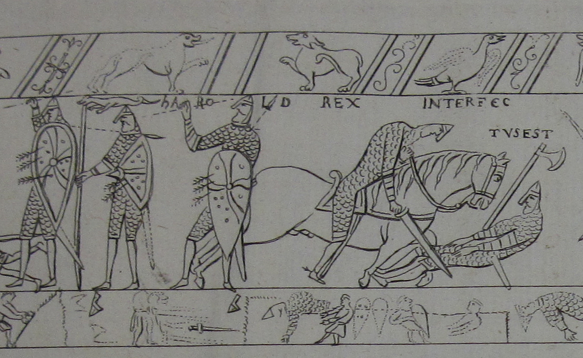 해럴드의 죽음을 묘사한 삽화에서 해럴드 2세의 신원을 둘러싸고 논쟁이 있다. 일부 최근의 역사가들은 해럴드가 눈에 화살을 맞은 인물이라는 전통적인 견해에 동의하지 않으며, 화살은 수리 기간 이후 18세기/19세기에 수정된 것이라고 주장한다.[20] 1729년 베누아의 판화와 1730년 베르나르 드 몽포콘의 태피스트리 판화에는 화살 대신 창이나 투창이 묘사되어 있으며 화살 깃털은 없다. 게다가, 린넨에 있는 바늘 구멍은 무언가가 제거되거나 짧아졌으며, 화살을 형성하기 위해 깃털이 추가되었음을 시사한다.[20] 다음 판에는 칼에 찔려 죽는 인물이 있으며, 그 인물 위의 문구는 해럴드의 죽음을 언급한다("interfectus est", "그가 죽었다").