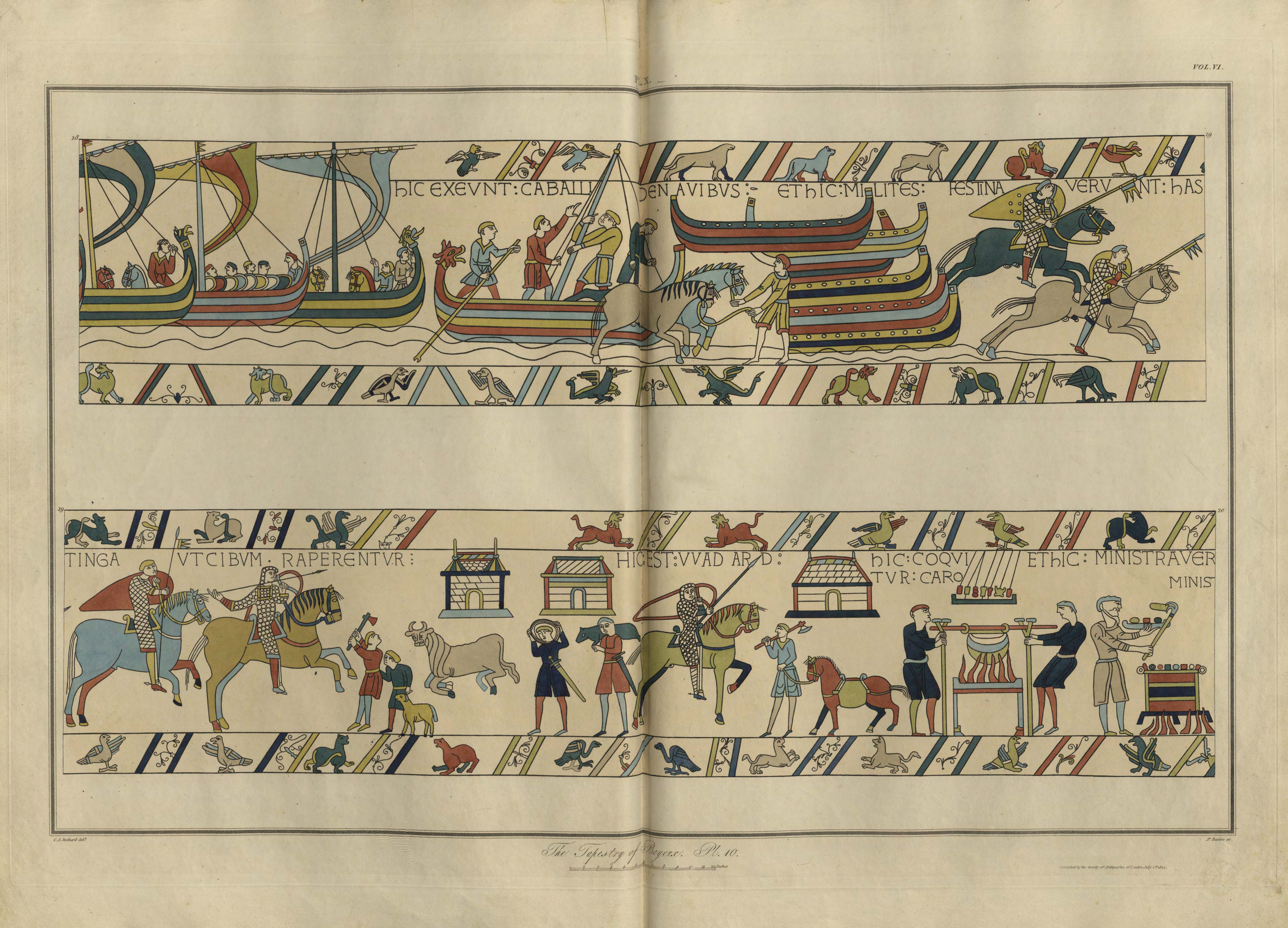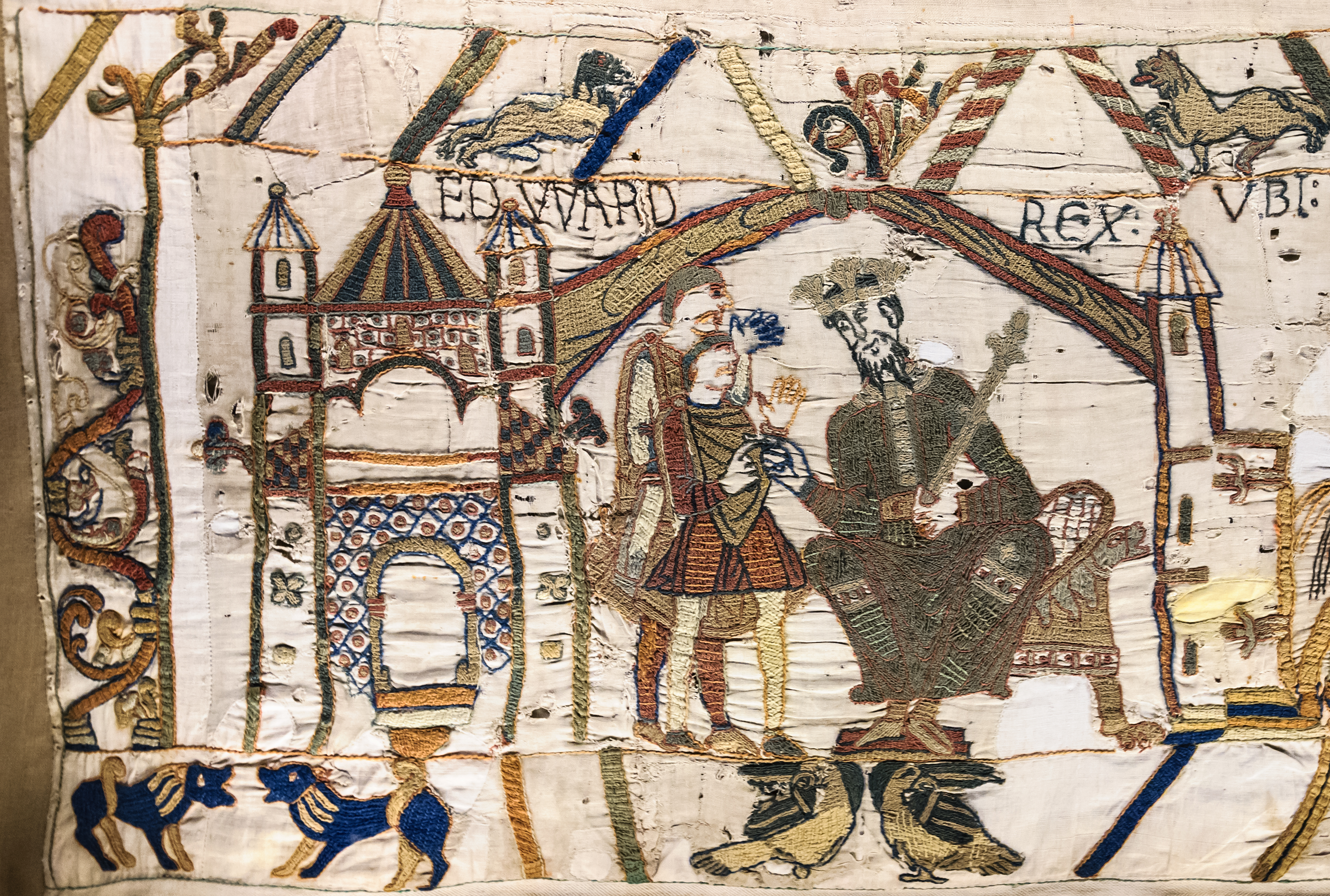 바이외 태피스트리는 엄밀히 말하면 직물인 태피스트리가 아니라, 천에 자수를 놓아 이야기를 그린 작품이다.[82] 원래 길이는 약 70 m로 추정되지만, 현재 남아있는 부분은 63.6m, 너비는 약 0.5m이다. 헤이스팅스 전투 부분이 현존한다. 11세기 프랑스와 잉글랜드 관련 역사적 유물이며, 당시 의상, 무기, 군선, 전투 방법 등을 보여주는 귀중한 사료이다. 핼리 혜성의 출현 기록 중 하나로도 알려져 있다.