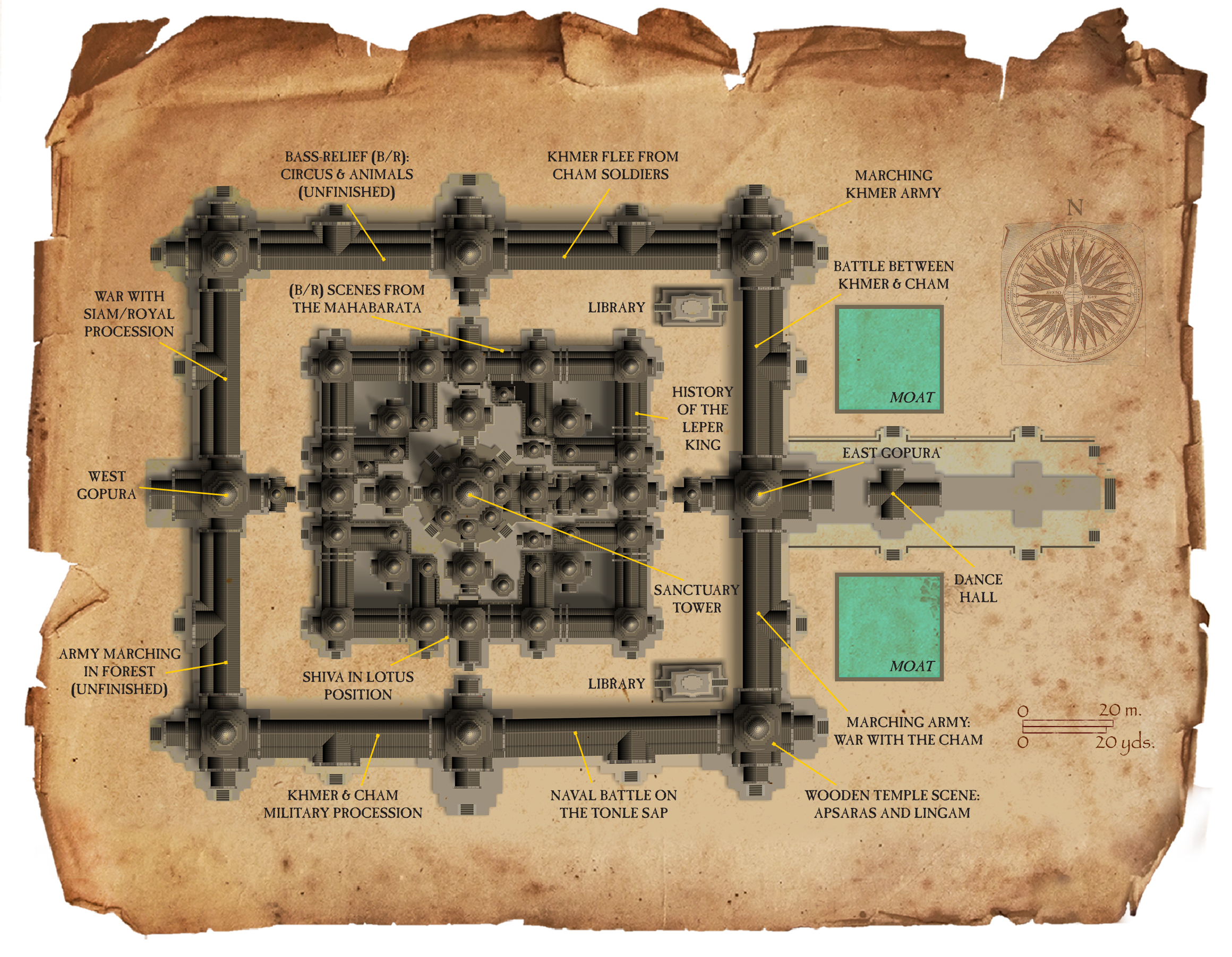 - 남동쪽 모퉁이 정자에는 미완성 사원 장면이 있으며, 탑, 압사라(អប្សរា|압사라km), 링가(លិង្គសិវៈ|링가km)가 있다.