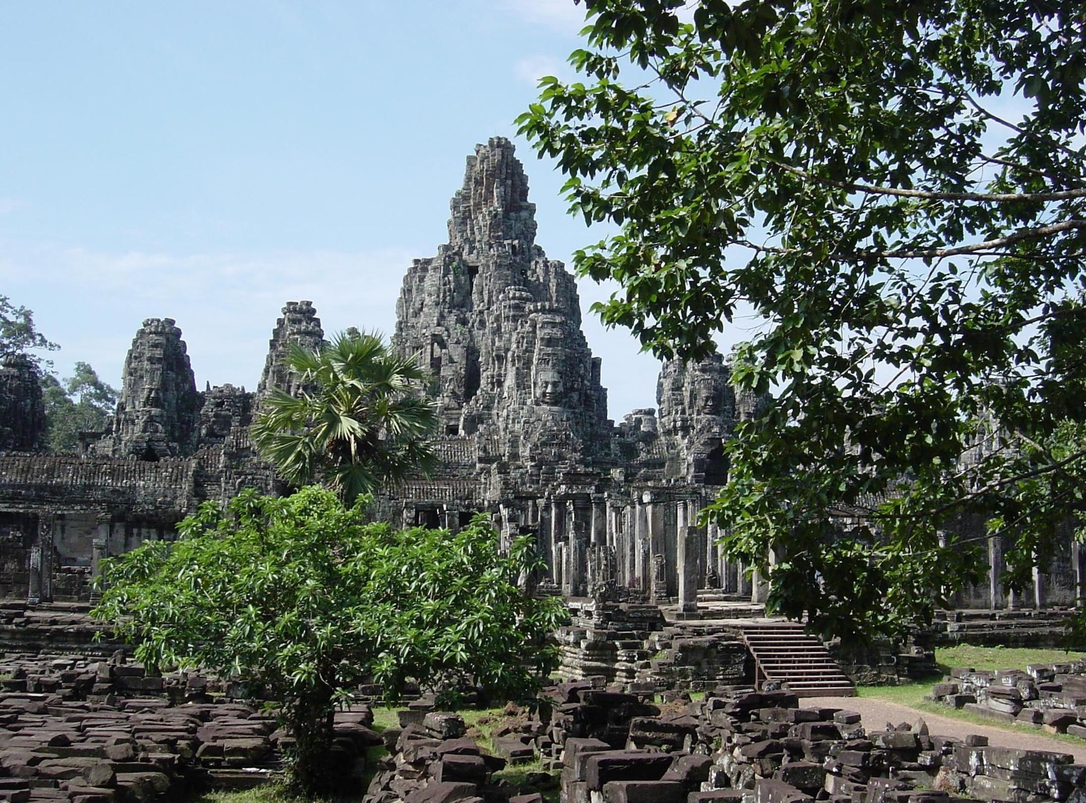 바이욘은 앙코르 톰의 중앙에 위치한 사원으로, 12세기 말 자야바르만 7세에 의해 건설된 크메르 제국의 마지막 국가 사찰이다. 처음에는 대승 불교 사원으로 시작했으나, 힌두교의 영향을 받아 힌두교 사원으로 변모하기도 했다. 바이욘의 가장 큰 특징은 탑의 사면에 조각된 인면상으로, 자야바르만 7세의 얼굴을 본뜬 것이거나 관세음보살을 표현한 것으로 추정된다. 사원은 3층 구조로, 1층에는 회랑과 부조, 2층에는 힌두교 관련 부조, 3층에는 인면상이 조각된 탑들이 있다.