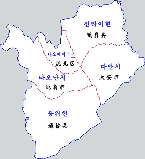 - 1958년 11월 21일 - 바이청 현의 일부가 분리되어 바이청 시가 발족하고, 타오난 현 및 바이청 현의 잔부가 합병하여 타오안 현이 발족하였다. 다라이 현과 안광 현이 합병하여 다안 현이 발족하고, 카이퉁 현과 잔위 현이 합병하여 퉁위 현이 발족하였다. (1시 7현 1자치현)
