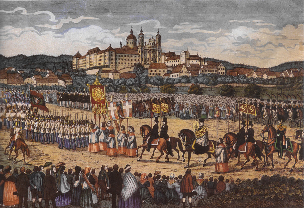 약 70년 후, 1268년 나폴리에서 콘라딘이 사망하면서 호엔슈타우펜 가문은 단절되었다. 그들의 이전 영지는 신성 로마 제국의 황실 재산으로 몰수되었다. 알트도르프의 작은 마을은 슈바벤의 ''Reichslandvogt''(황실 관리인 또는 집행관)가 통치했지만, 바인가르텐 수도원은 제국 자유 도시와 유사한 특권을 가진 "제국 수도원"의 지위를 얻었다. ''Landvogtei''는 1473/1486년에 오스트리아 대공 지기스문트에게 담보로 제공되어 외오스트리아의 구역으로 통합되었다.[2]