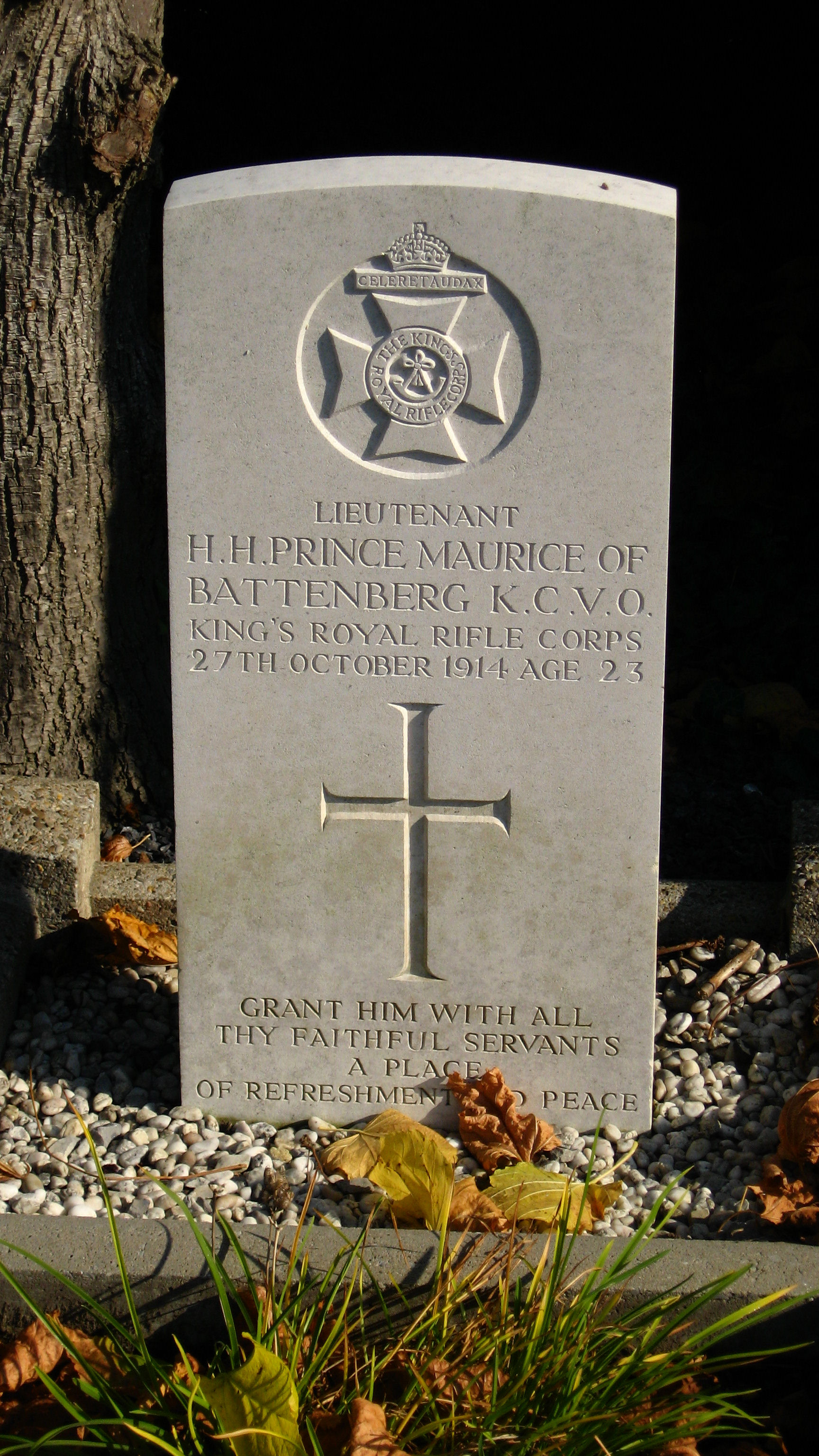 바텐베르크 공자 모리스는 제1차 세계 대전에 참전하여 1914년 10월 벨기에 이퍼르에서 벌어진 제1차 이프르 전투에서 전사했다.[5][6] 스코틀랜드 애버딘셔의 밸모럴 성에서 하인리히 폰 바텐베르크 공자와 영국 공주 베아트리스 사이에서 태어난 그는[11][12] 영국 육군 킹스 로열 라이플 군단 소속 소위로 참전했다.[5]제1차 이프르 전투 당시 존네베케에서 전투 중 사망했으며,[5][6] 그의 죽음은 제6 보병 여단 사령관 팬쇼우 준장, 제2 사단 사령관 찰스 먼로 소장을 거쳐 제1 군단 사령관 더글러스 헤이그 중장에게 보고되었다.[5] 헤이그는 모리스 공자가 "존네베케 동쪽 능선에서 공격을 위해 자신의 부대를 용감하게 이끌다 포탄에 맞아 사망했다"고 보고했다.[5] 그는 "바텐베르크 공자 모리스의 죽음으로 육군은 가장 용감하고 가치 있는 장교를 잃었다. 평화와 전쟁에서 그는 국왕과 국가에 대한 의무를 다했다"고 말했다.[5]