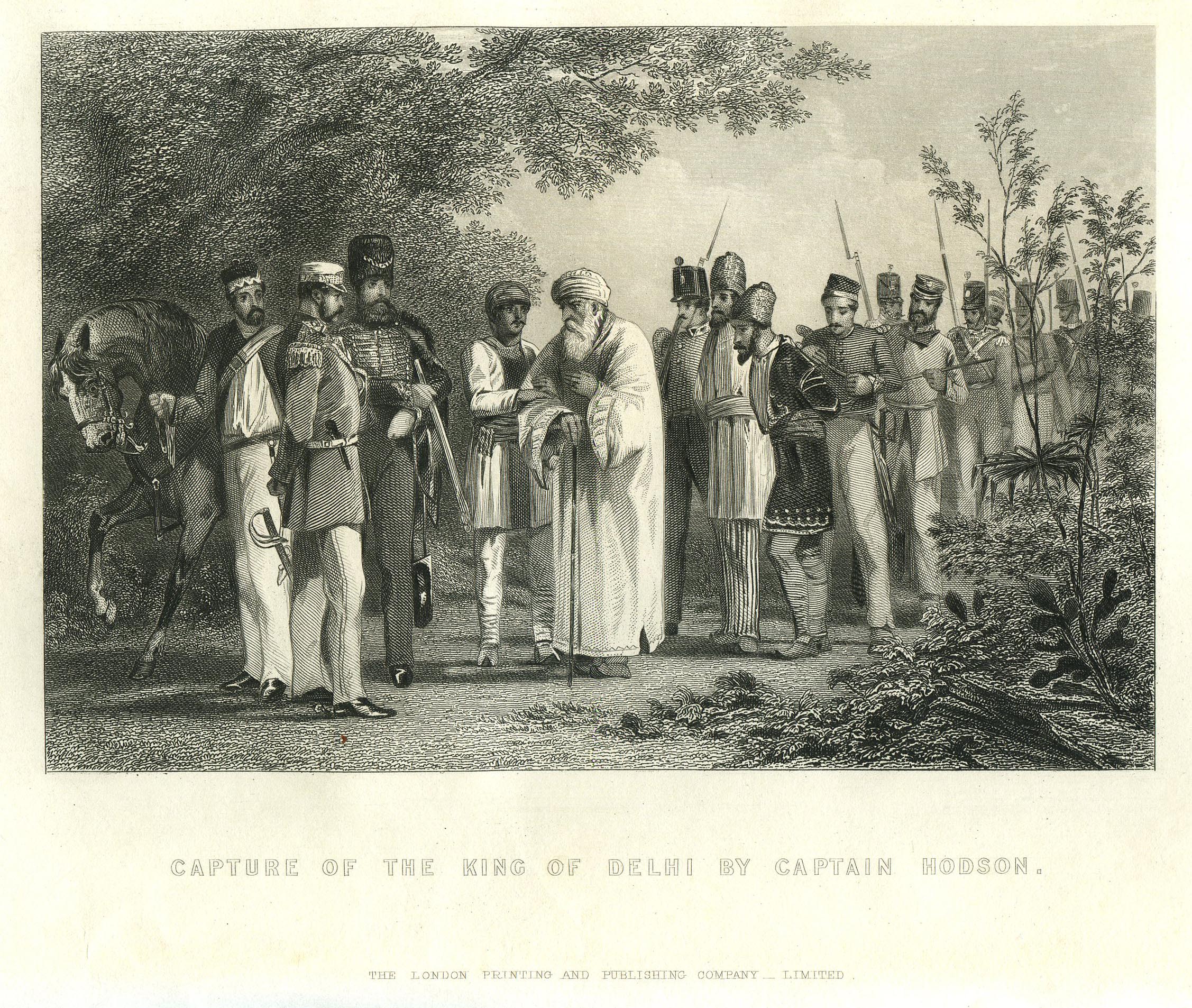 영국군의 승리가 확실해지자, 바하두르 샤 2세는 델리 외곽의 후마윤 묘지로 피신했다. 그러나 윌리엄 호드슨이 이끄는 영국군의 추격을 받아 1857년 9월 20일에 체포되었다.[38] 다음 날인 9월 21일, 호드슨은 황제의 아들 미르자 무굴, 미르자 키즈르 술탄과 손자 미르자 아부 바크트를 델리 게이트 근처에서 즉결 처형하고 델리 함락을 선언했다.[50][38][41][13] 이 소식을 들은 바하두르 샤 2세는 큰 충격에 빠져 아무 말도 하지 못했다고 한다.[13] 델리가 함락된 후 영국군은 도시에서 보복적인 약탈과 학살을 자행했다.[50]