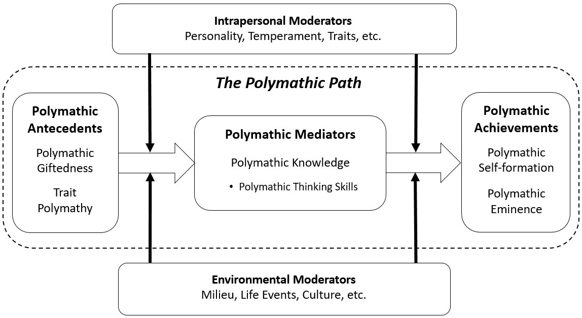 코네티컷 대학교 네그 교육대학의 제임스 C. 카우프만과 같은 대학의 로널드 A. 베게토는 모든 사람이 박식가가 될 가능성이 있는지와 창의성의 영역 일반성 또는 영역 특수성 문제를 연구했다.[32][33]이전의 창의성에 대한 4-C 모델을 바탕으로, 베게토와 카우프만[34][35]은 어디에나 있는 미니-C 박식가에서 저명하지만 드문 빅-C 박식가에 이르는 박식가의 유형과, 박식가이든 아니든, 창의적인 성취의 최고 수준에 도달할 수 있는 사람에게 필요한 몇 가지 요구 사항이 있는 모델을 제안했다. 그들은 창의적인 시도가 성공하기 위해 필요한 세 가지 일반적인 요구 사항, 즉 지능, 창의적이려는 동기 부여, 창의적인 표현을 허용하는 환경을 설명한다. 그런 다음, 선택한 영역에 따라 보다 구체적인 능력이 필요하다. 개인의 능력과 관심사가 해당 영역의 요구 사항에 더 많이 일치할수록 더 좋다. 일부는 특정 영역에 대한 특정 기술과 동기를 개발하는 반면, 박식한 사람들은 다양한 영역에서 다양한 주제를 추구하려는 내적 동기(및 능력)를 보일 것이다.[35]