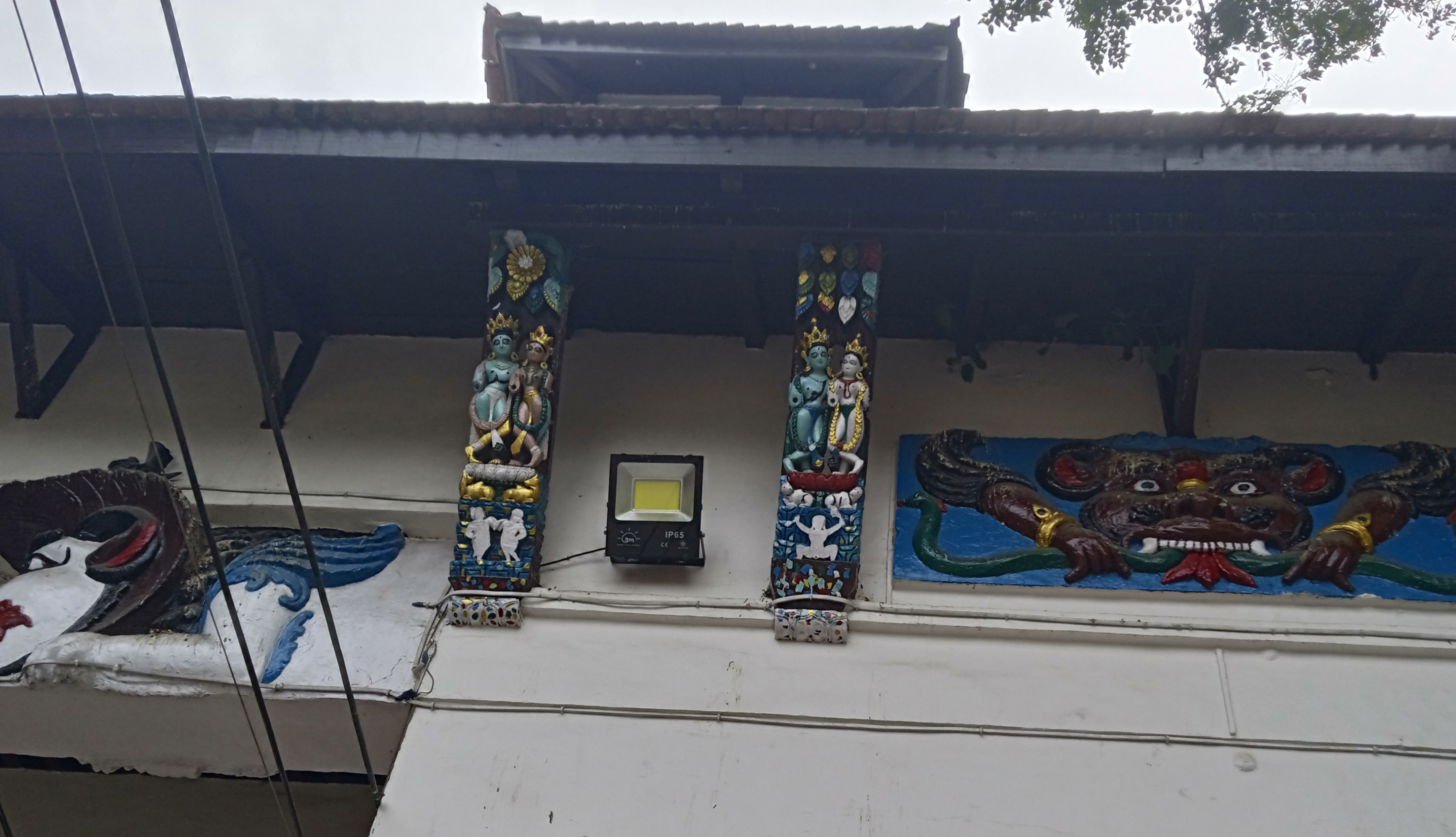 1934년 네팔-인도 지진 이후 크리슈나를 묘사한 나무 버팀대는 카트만두 뉴 로드 게이트를 장식하는 데 사용되었다.[34][33] 1987년 복원 때 반환을 거절당했다.[34][33] 뉴 로드 게이트에 있다.[34]