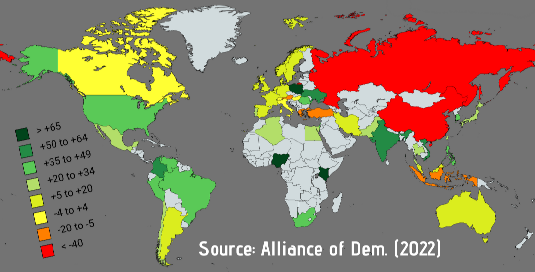 부정적 의견 비율 | 요르단: 82% 튀르키예: 72% 러시아: 66% 독일: 66% 레바논: 64% 멕시코: 61% 네덜란드: 62% 그리스: 59% 프랑스: 60% 튀니지: 56% 캐나다: 56% 아르헨티나: 48% 스페인: 54% 칠레: 47% 스웨덴: 50% 인도네시아: 43% 영국: 43% 오스트레일리아: 42% 베네수엘라: 35% 이탈리아: 39% 콜롬비아: 38% 페루: 38% 브라질: 32% 세네갈: 29% 남아프리카 공화국: 29% 탄자니아: 25% 헝가리: 30% 일본: 29% 가나: 20% 인도: 9% 나이지리아: 22% 케냐: 21% 폴란드: 18% 미국: 18% 이스라엘: 17% 필리핀: 12% 베트남: 11% 대한민국: 4% |
