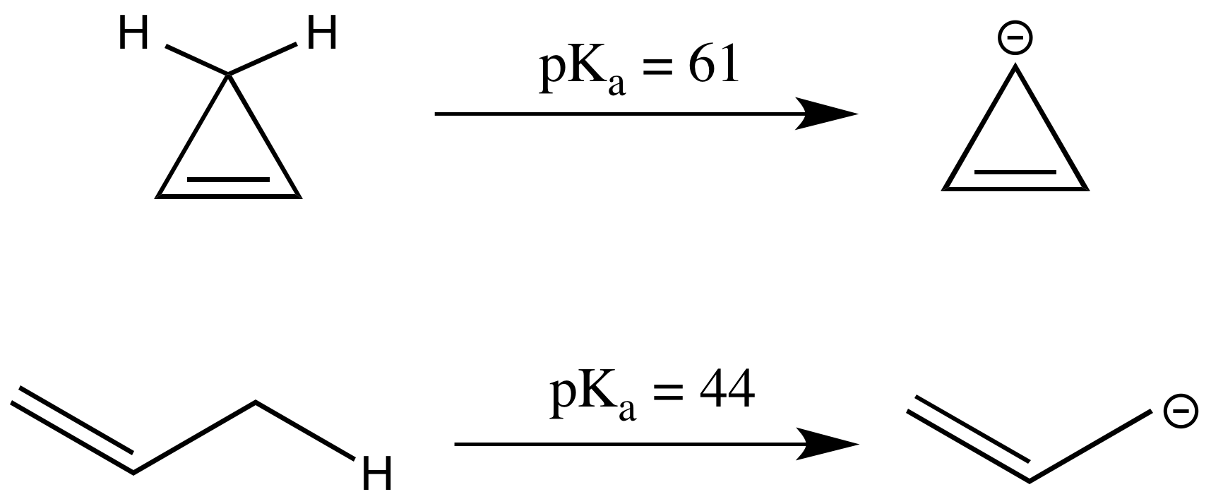 반방향족성은 p''K''a에도 큰 영향을 미칠 수 있다. 선형 화합물 프로펜은 p''K''a가 44로, sp3 탄소 중심에서 비교적 산성이 높은데, 이는 생성된 알릴 음이온이 공명 안정화될 수 있기 때문이다. 그러나 사이클로프로페닐 음이온은 고리형 시스템에 4개의 π 전자를 가지고 있으며, 실제로 반방향족이므로 불안정하기 때문에 1-프로펜보다 p''K''a가 상당히 ''높다.''[3]
