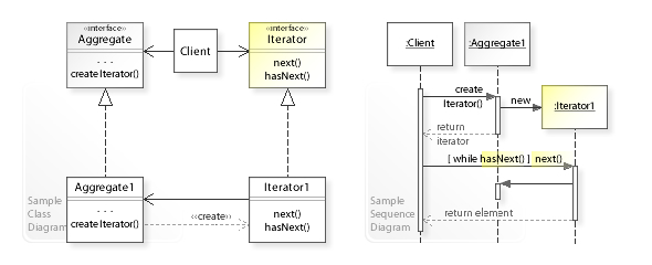 위의 UML 클래스 다이어그램에서, `Client` 클래스는 (1) `Iterator` 객체를 생성하기 위해 `Aggregate` 인터페이스를 참조하고 (createIterator|크리에이트 이터레이터영어) (2) `Aggregate` 객체를 순회하기 위해 `Iterator` 인터페이스를 참조한다 (next|넥스트영어, hasNext|해즈 넥스트영어).