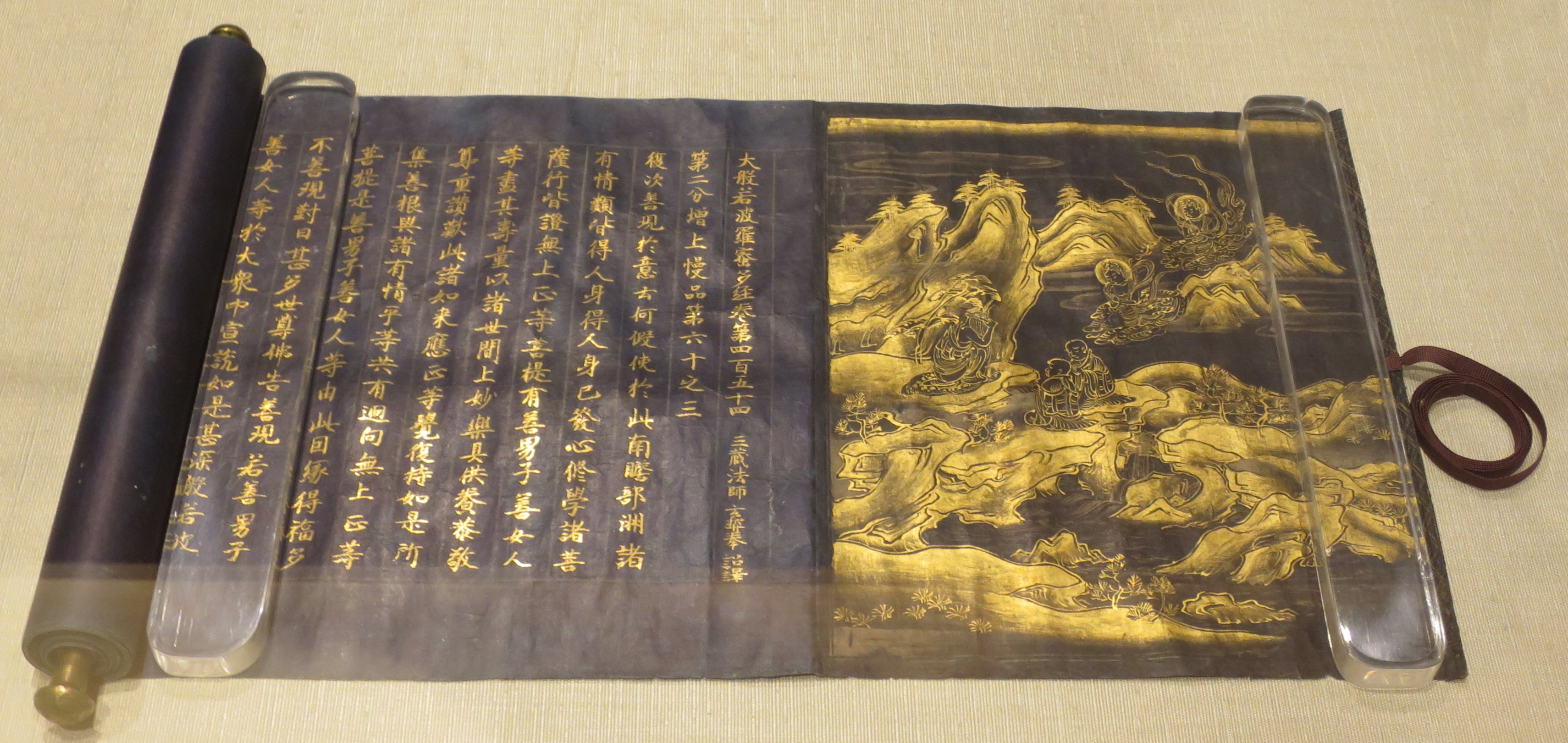 현장(602-664)은 방대한 산스크리트어 반야경(般若經) 모음집인 "현장 반야경 도서관" 또는 "대반야바라밀다경"(般若 波羅蜜 多 經, 병음: ''bōrě bōluómì duō jīng'')을 번역한 것으로 유명하다.[32] 현장은 남인도에서 얻은 이 산스크리트어 원전 세 권을 가지고 중국으로 돌아왔으며, 그의 번역은 이 세 자료를 바탕으로 한 것으로 알려져 있다.[33] 총 600권의 두루마리에 500만 자의 한자가 포함되어 있다.