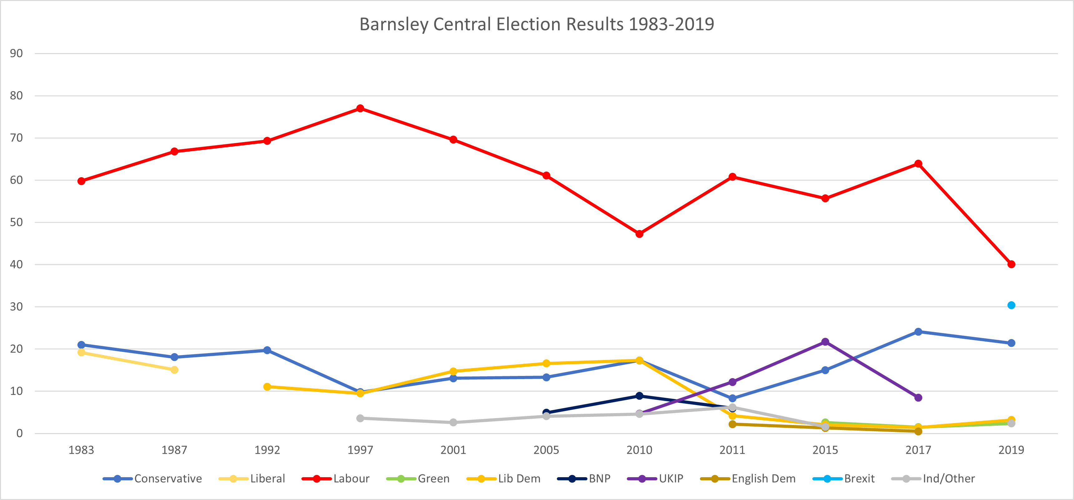 반즐리센트럴은 도시 지역구이며 주민의 절대다수가 중하위권 소득층이다. 옛 탄광촌의 공공주택 단지가 거의 대부분 속해 있다.[34] 1983년 지역구 신설 이래 노동당 후보가 당선되어 왔으며 텃밭 지역구로 분류된다. 다만 2019년 영국 총선에서는 노동당의 우위격차 득표율이 9.7%까지 줄어드는 모습을 보였다.[4]